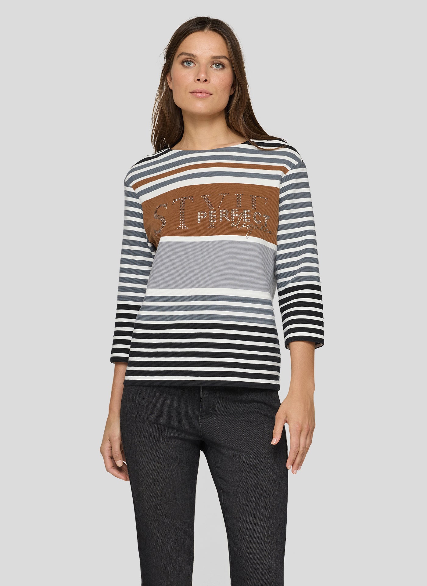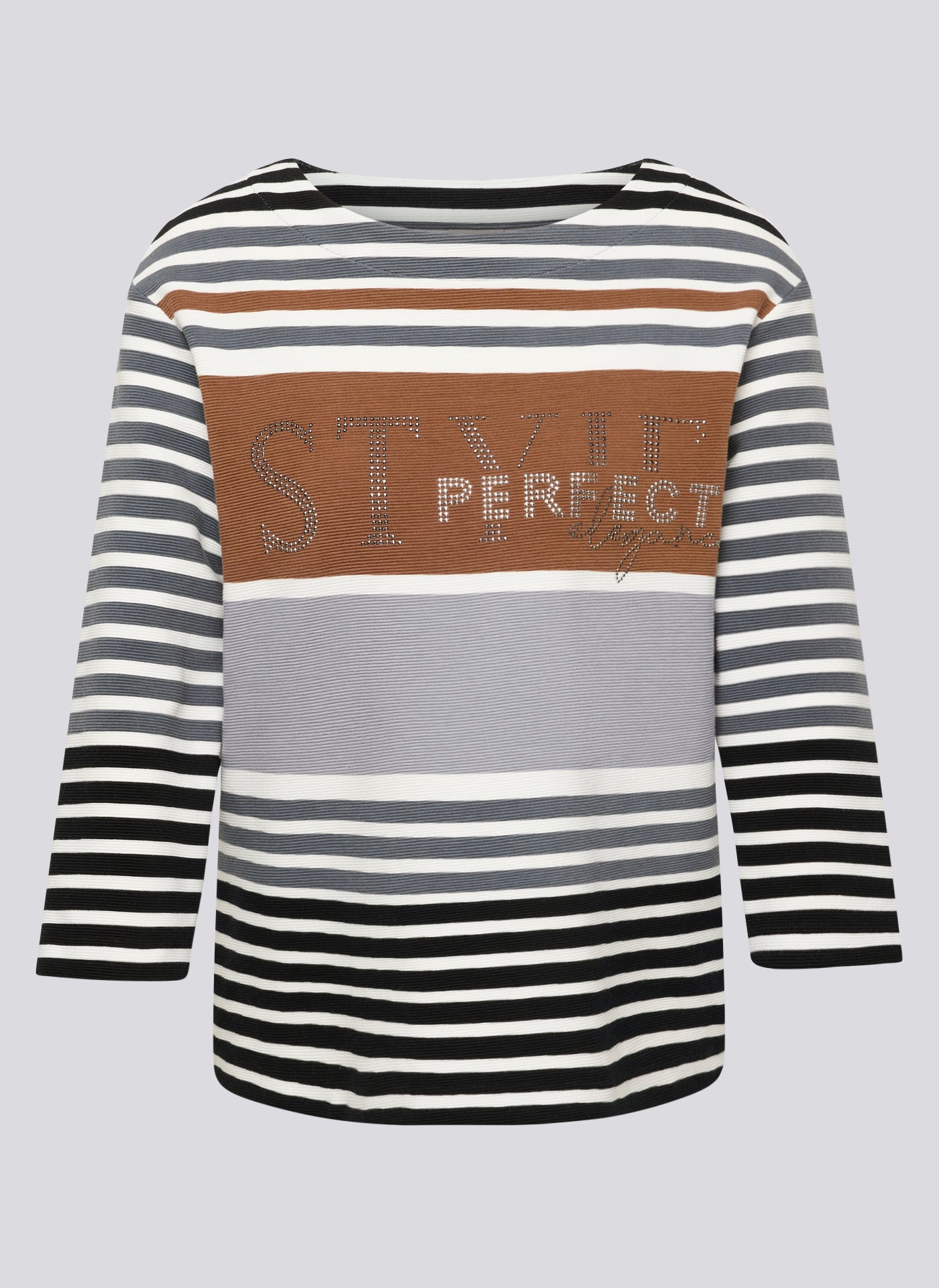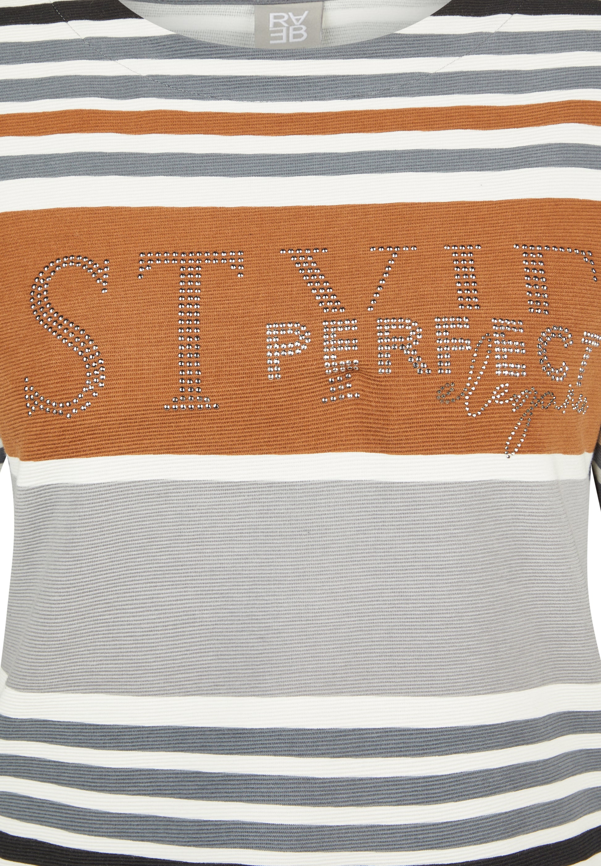 Das lässige Shirt überzeugt mit einem lebendigen Streifenmix in gedeckten Farben. Funkelnde Strasssteine auf der Front setzen stilvolle Akzente, ohne aufdringlich zu wirken. Der Rundhalsausschnitt und die 3/4-Ärmel runden das Design klassisch ab. Die weiche Jerseyqualität mit Stretchanteil sorgt für angenehmen Tragekomfort im Alltag. 3/4-Arm mit klassischem Rundhals. Strassdetails auf der Vorderseite. Einsatz in Rostton als Blickfang. Weiche Stretchqualität. Gedeckter Streifenmix für vielseitige Looks.