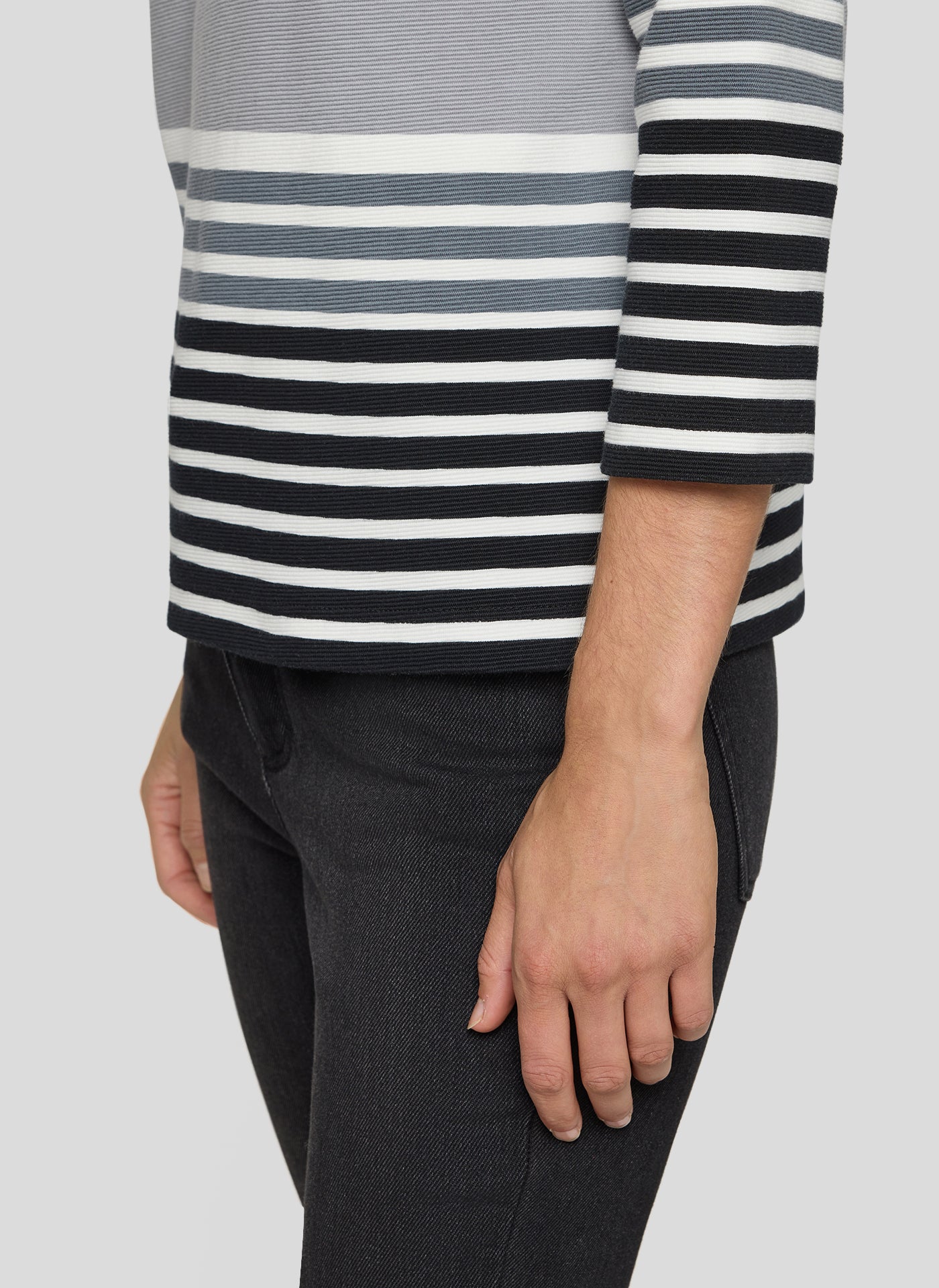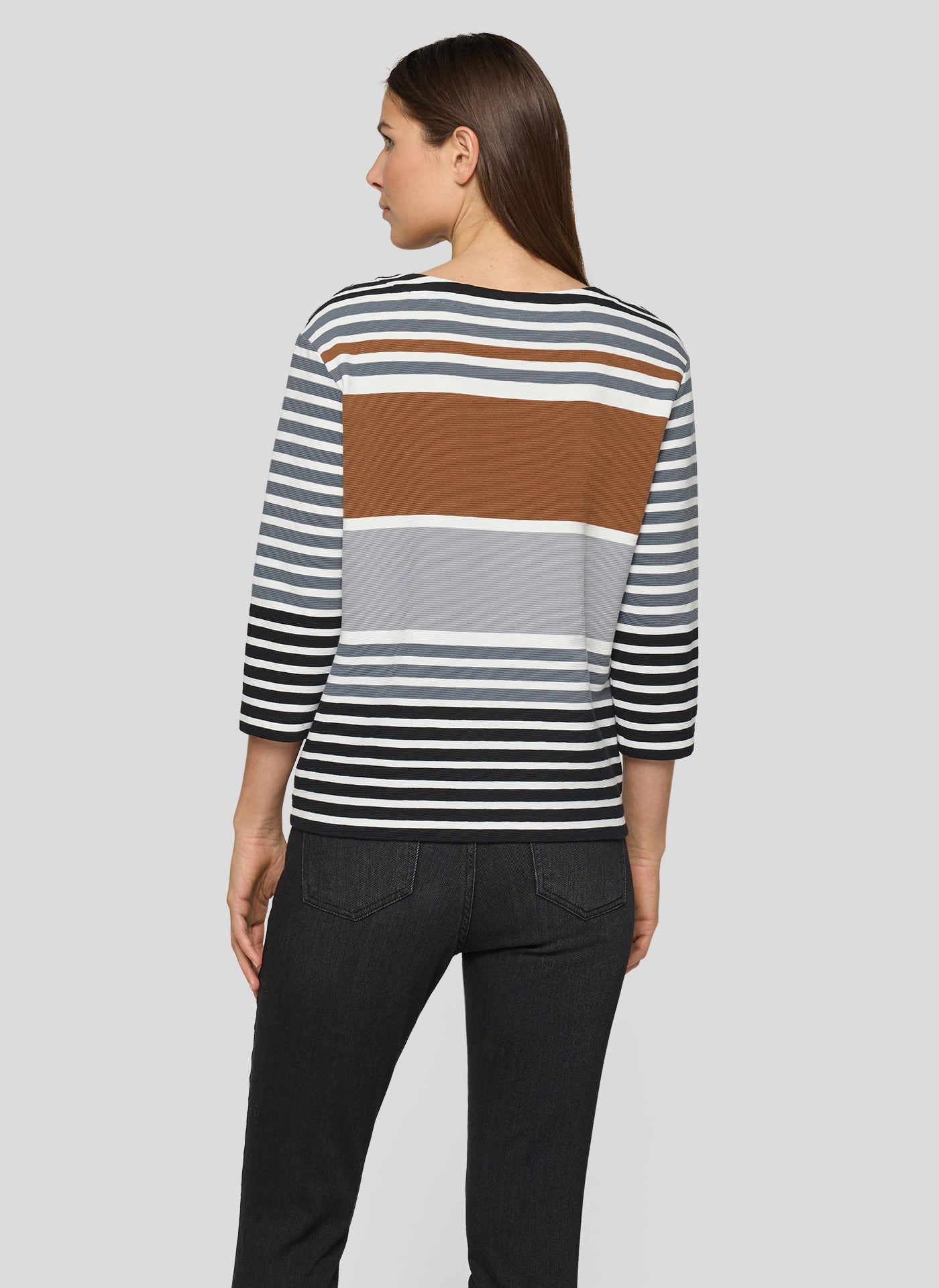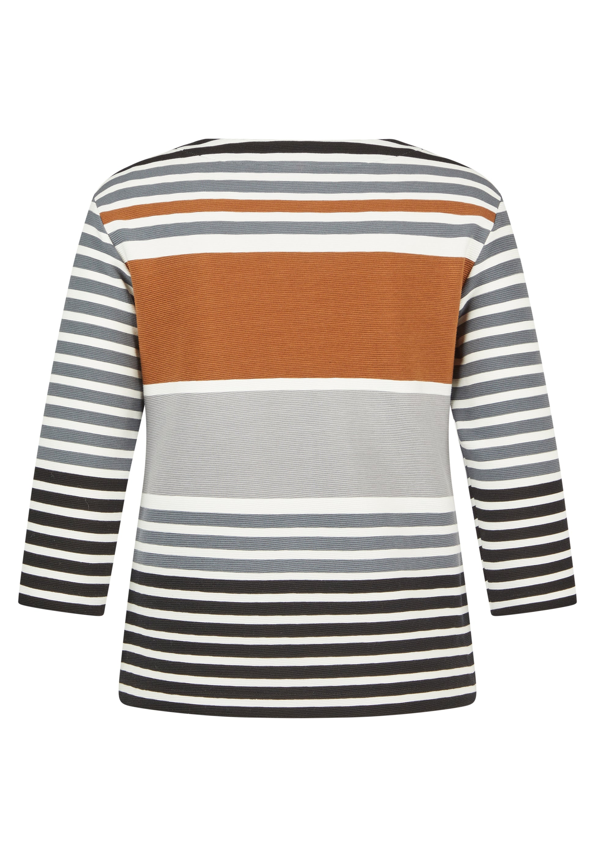 Das lässige Shirt überzeugt mit einem lebendigen Streifenmix in gedeckten Farben. Funkelnde Strasssteine auf der Front setzen stilvolle Akzente, ohne aufdringlich zu wirken. Der Rundhalsausschnitt und die 3/4-Ärmel runden das Design klassisch ab. Die weiche Jerseyqualität mit Stretchanteil sorgt für angenehmen Tragekomfort im Alltag. 3/4-Arm mit klassischem Rundhals. Strassdetails auf der Vorderseite. Einsatz in Rostton als Blickfang. Weiche Stretchqualität. Gedeckter Streifenmix für vielseitige Looks.