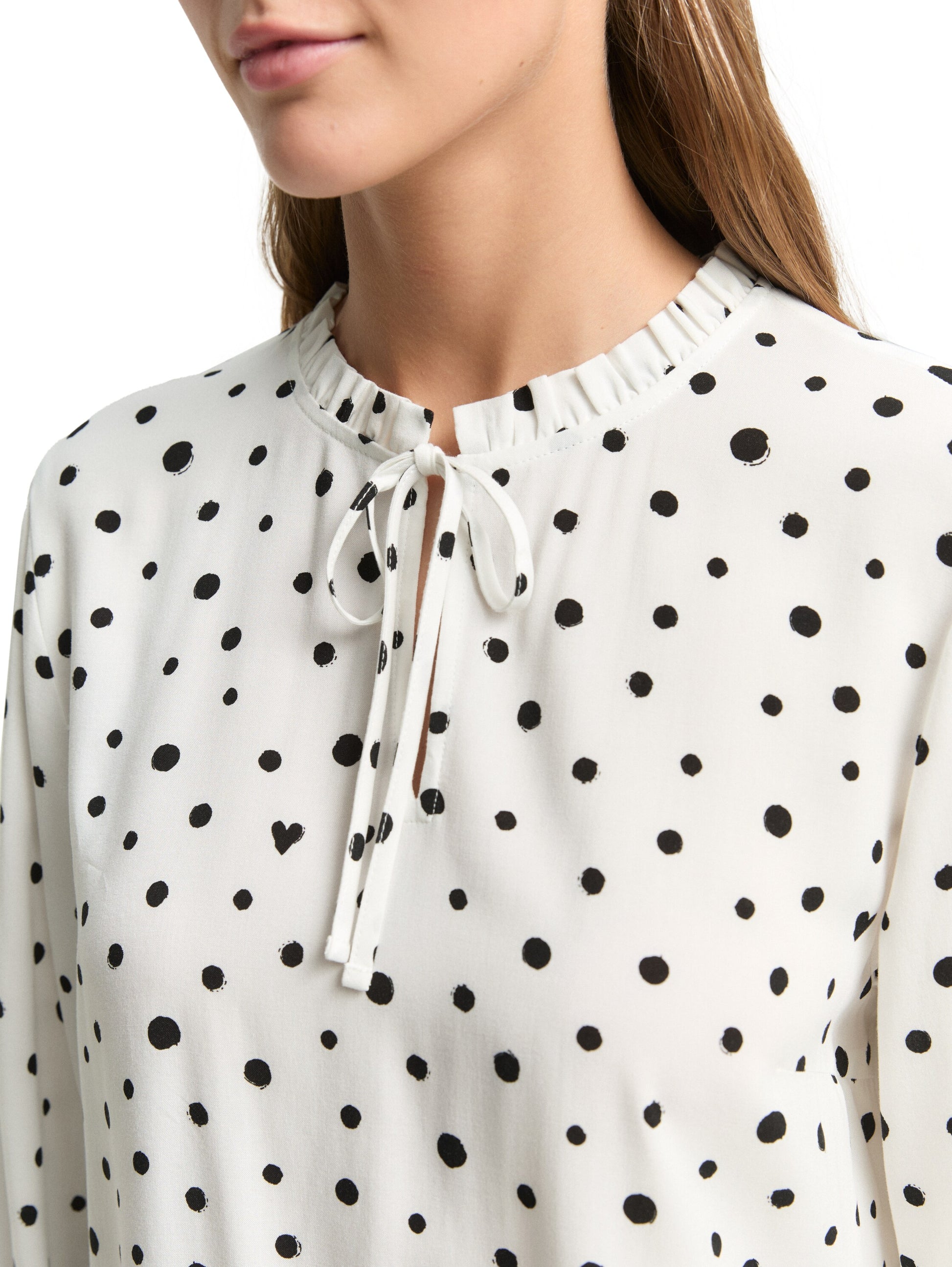 Gepunktete Bluse mit Rüschen und Kordelzug am Ausschnitt. Mit elastischem Gummibund am Ärmelsaum. Aus einem weichen Viskose-Stoff.