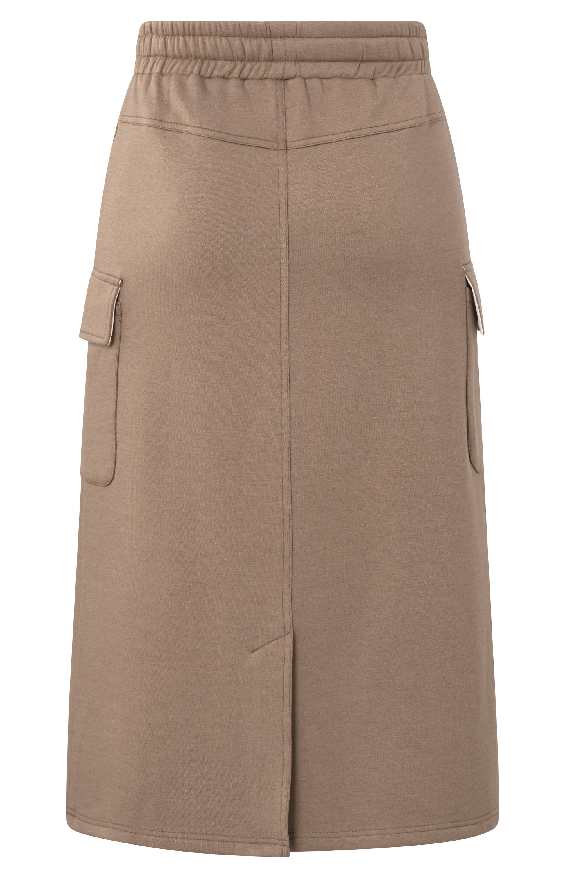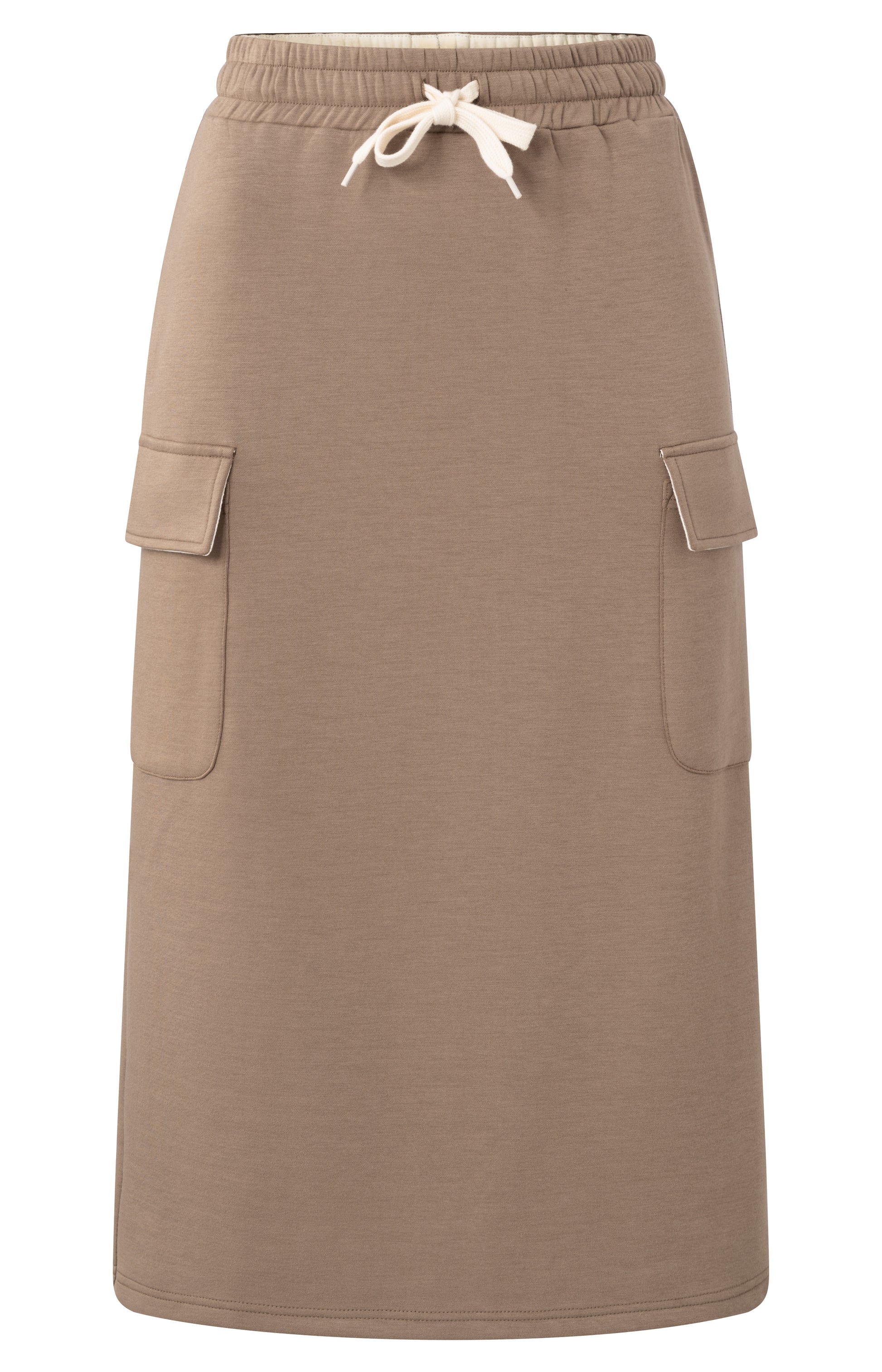 Dieser bequeme Midirock aus weichem Jersey-Stoff besticht durch seinen sportlichen Cargo-Look. Der elastische Bund mit Kordelzug sorgt für perfekten Sitz, während die aufgesetzten Taschen einen coolen Akzent setzen. Ein kleiner Schlitz hinten bietet zusätzliche Bewegungsfreiheit. Kombinieren Sie ihn mit einem Pullover oder einer Bluse für einen lässig-schicken Look. Rocklänge: 82 cm. Das Model ist 174 cm groß und trägt Größe S.