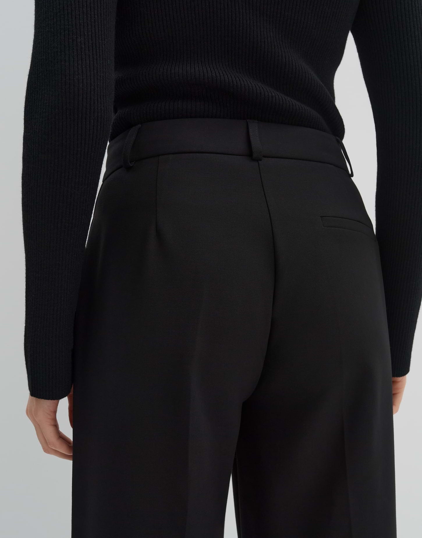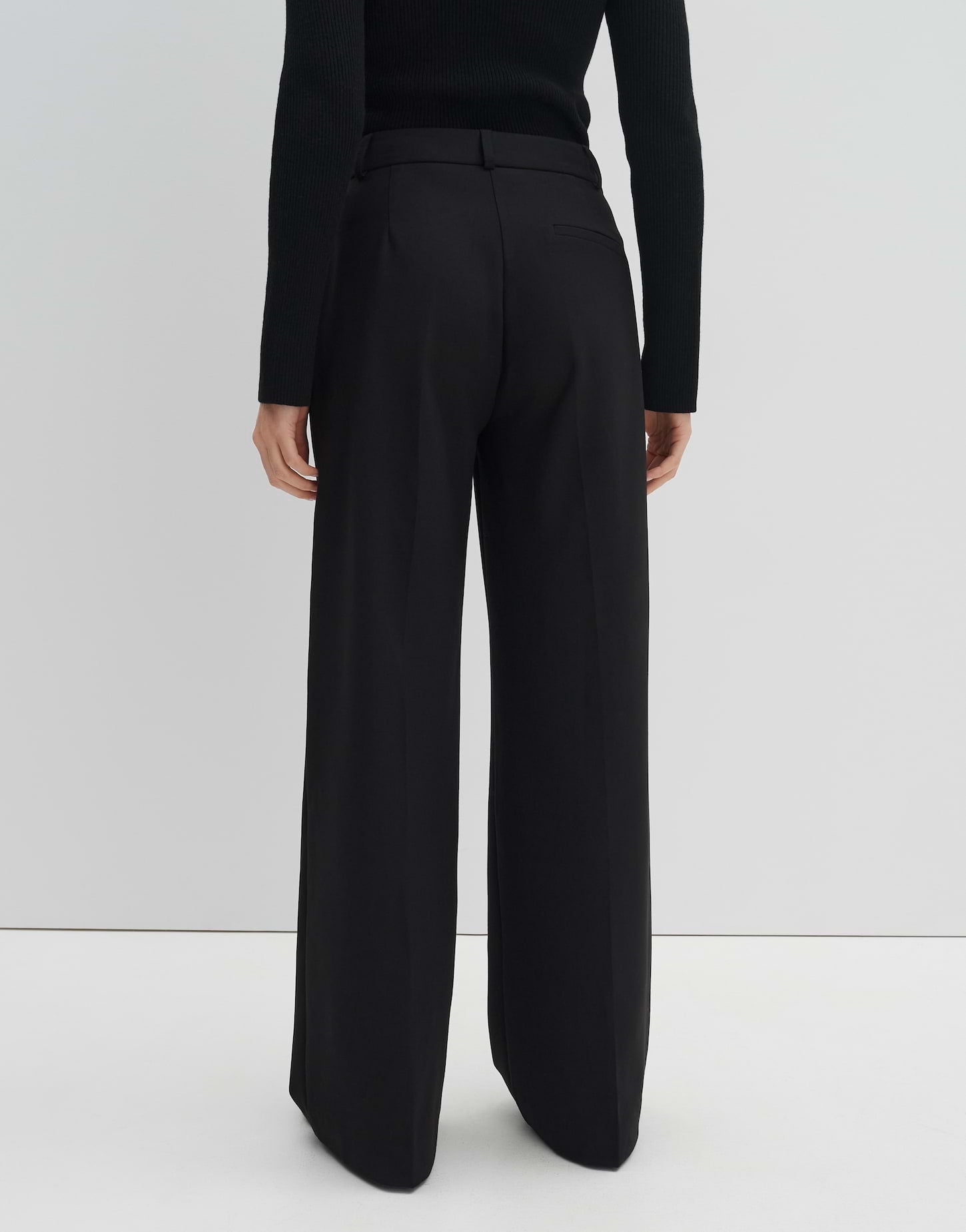 Recycled Polyester Mix, langes, weites Bein, Bügelfalten, schwerer, weicher Stoff, maximaler Komfort, klassischer Verschluss, Paspeltasche hinten, Beininnenlänge ca. 81 cm, Schwarz: Model Größe 177 cm – Hüftbreite 89 cm – trägt Größe 36