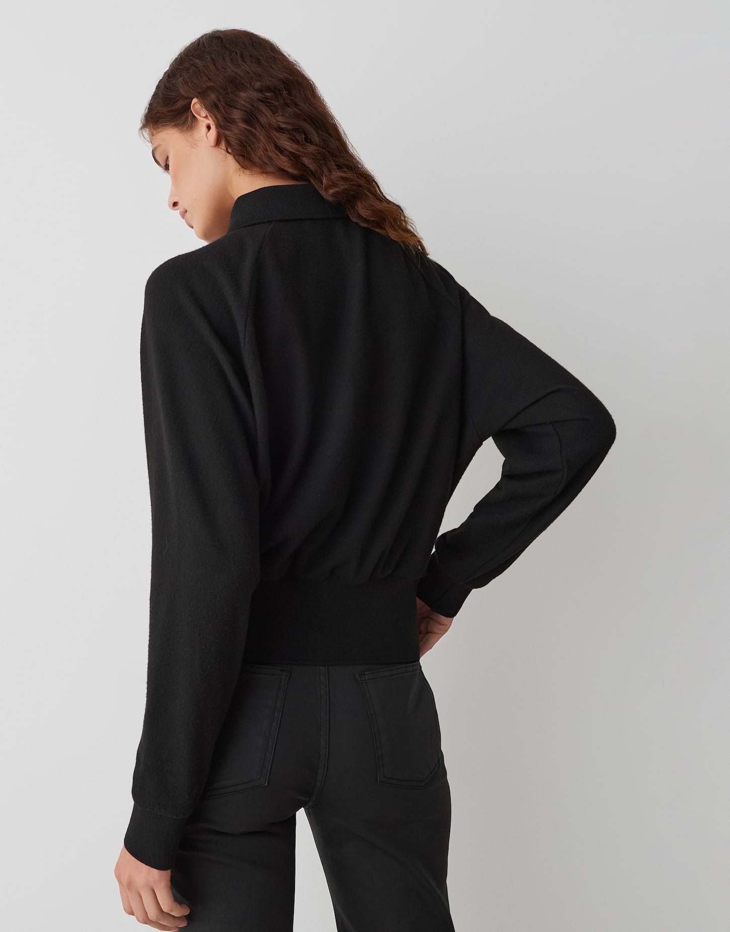 lockere Passform, schmal zulaufend, Fledermausärmel mit Raglan, Polokragen, Rückenlänge ca. 55 cm bei Größe 36, Model Größe 177 cm – trägt Größe 36, Sweatware, weicher Griff, fließender Fall, elastische Rippbündchen, kurze Knopfleiste