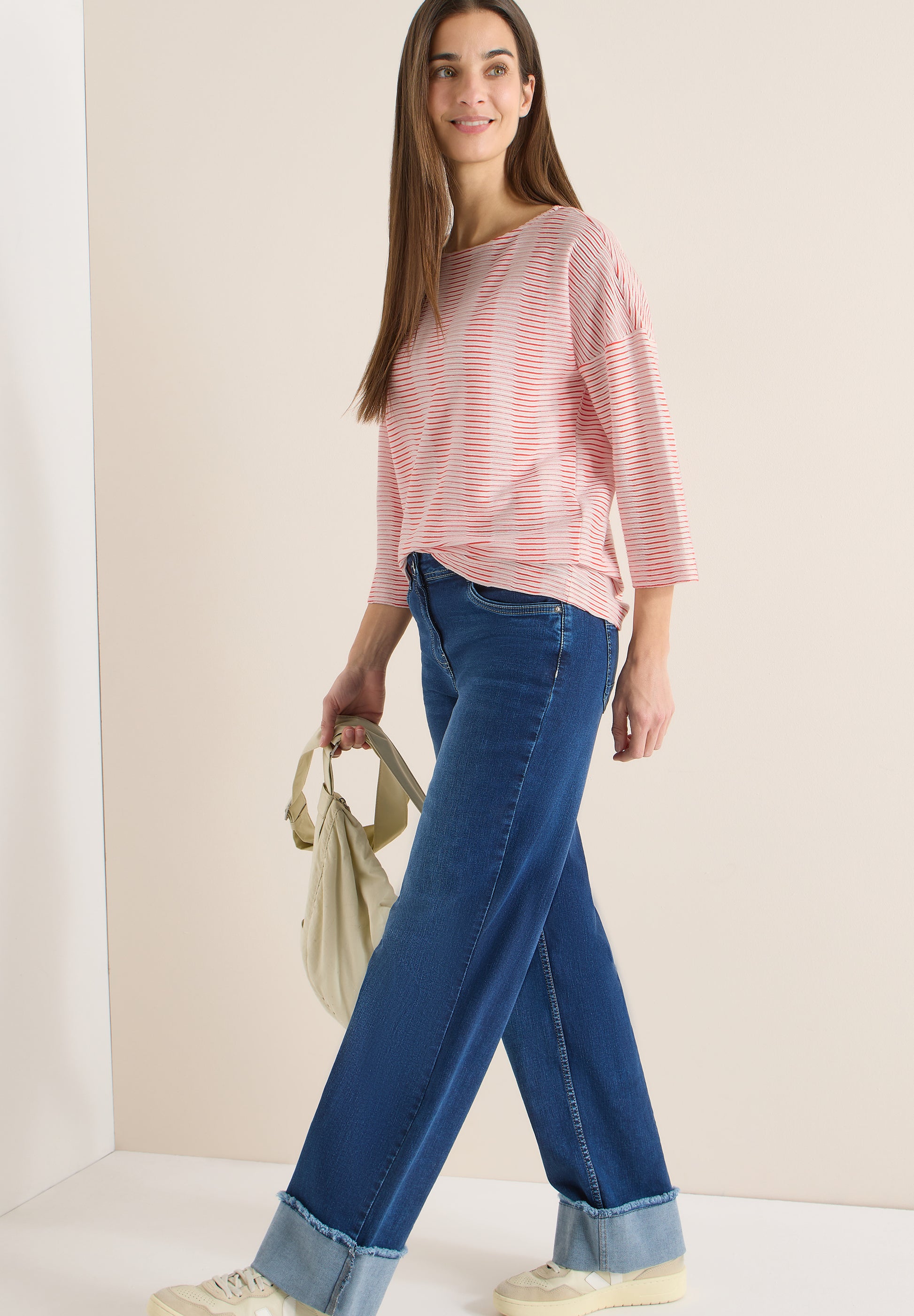 Dieses Shirt von CECIL für Damen kombiniert ein Streifenmuster mit einer welligen Struktur für einen modernen Look. Der softe Baumwoll-Modalmix bietet hohen Tragekomfort für jeden Tag. Ideal für entspannte Styles mit sportiver Note. Damenshirt Casual U-Boot-Ausschnitt 3/4-Arm Bequem Material: 50% Baumwolle, 50% Modal