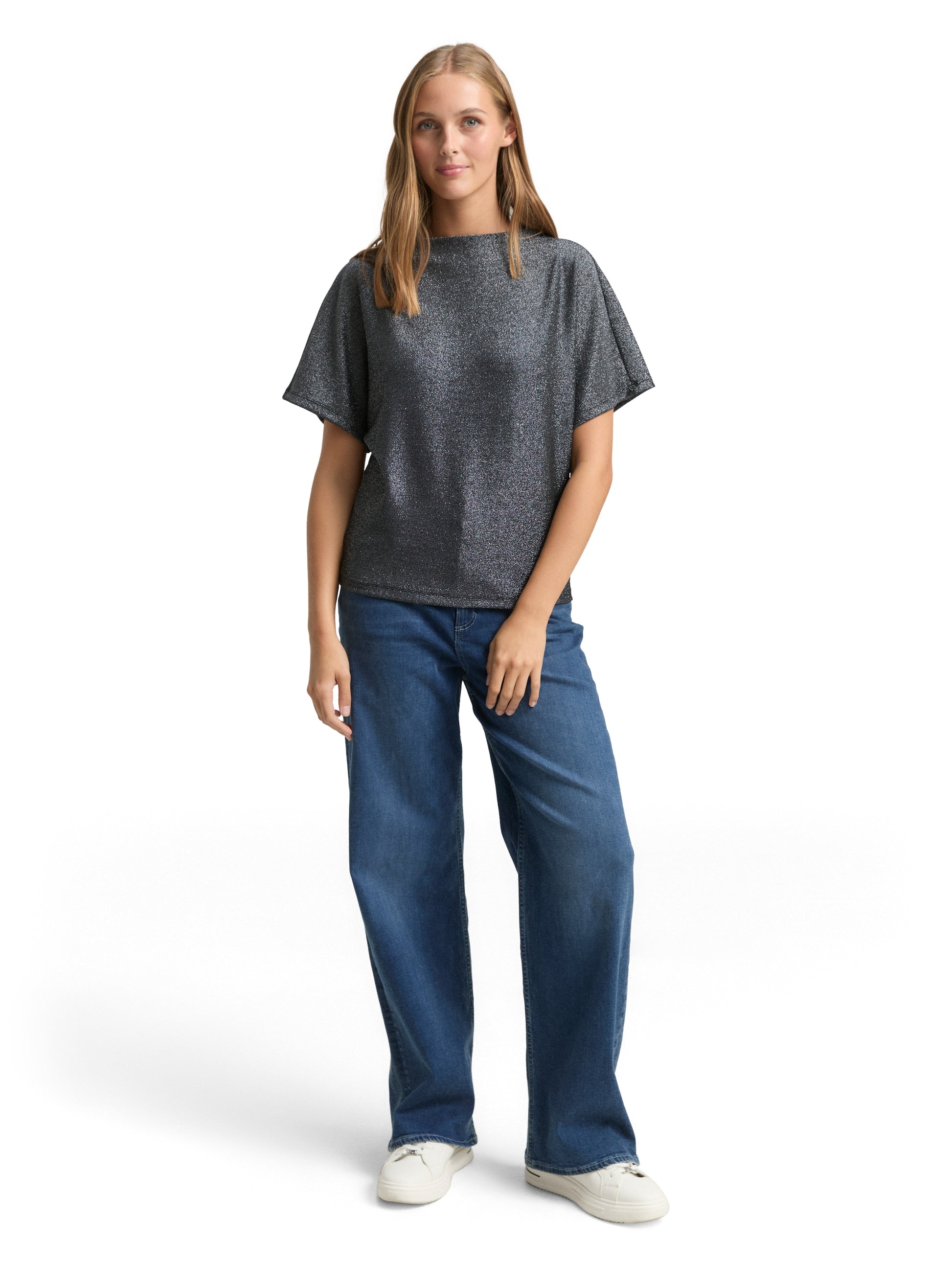 T-Shirt mit kurzem Stehkragen und Fledermausärmeln. Aus einem glitzernden Stoff in Metall-Optik.