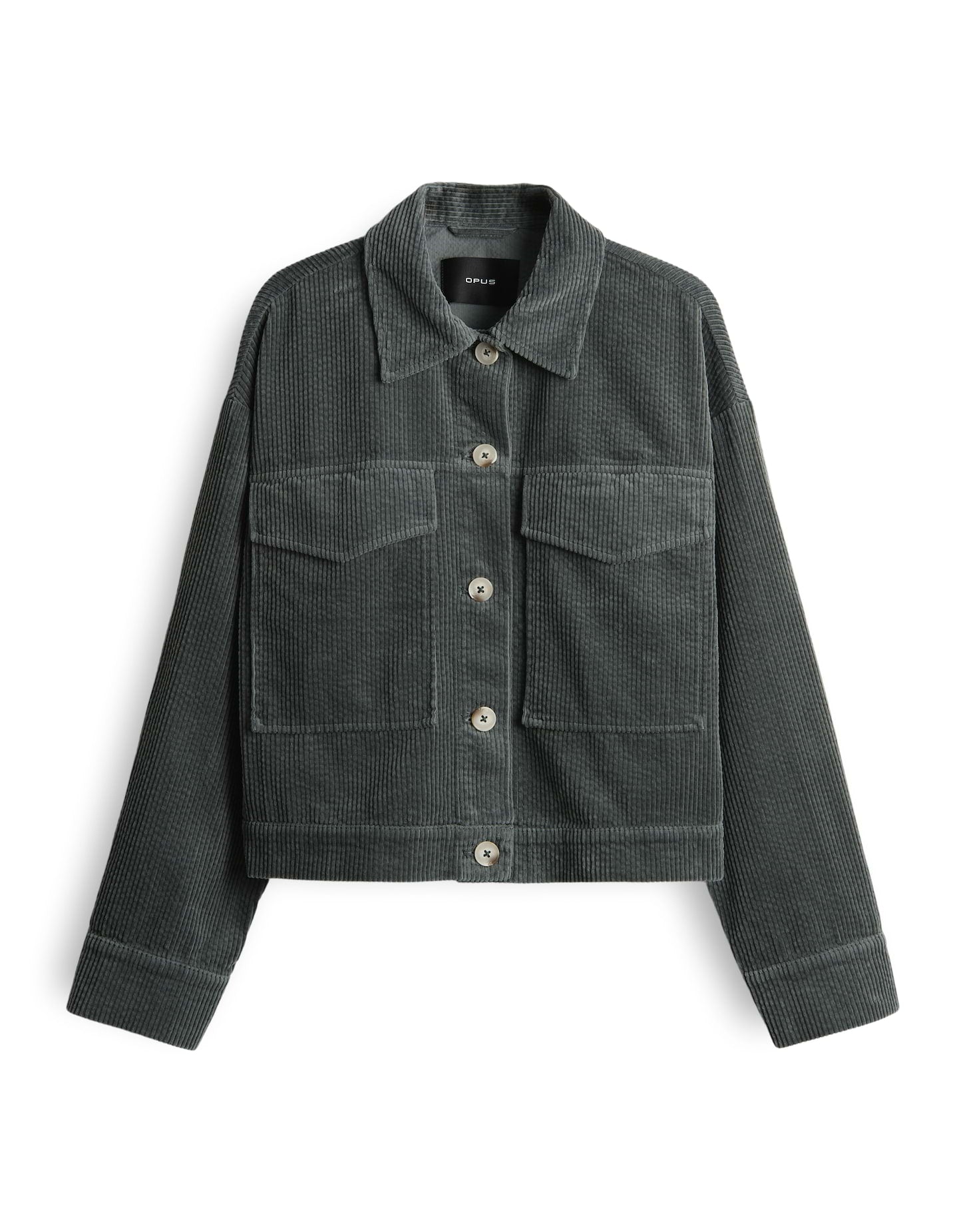 lockere Passform, gerader Schnitt, verkürzte Länge, überschnittene Schulter mit Langarm, Umlegekragen, Rückenbreite ca. 56 cm bei Größe 36, Model Größe 178 cm – trägt Größe 36, Rückenbreite ca. 49 cm bei Größe 36, Cord, Webware, ungefüttert, Rippstruktur, weicher Griff, samtige Oberfläche, aufgesetzte Cargotaschen, Knopfleiste, Schlitz am Ärmelsaum, Knöpfe in Horn Optik