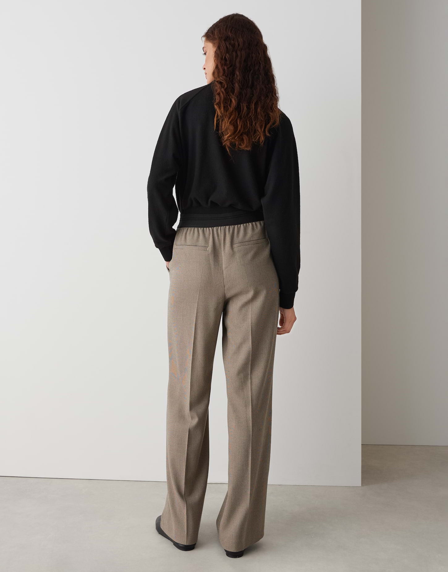 weiter, gerader Beinverlauf, Hosenbein Innenlänge ca. 80 cm in jeder Größe, Model Größe 177 cm – trägt Größe 36, Webware, weicher Griff, fließender Fall, knitterarm, Pepita, Eingrifftaschen, Zier-Paspeltaschen hinten, Bundfalten, Bügelfalten, elastischer Gummibund