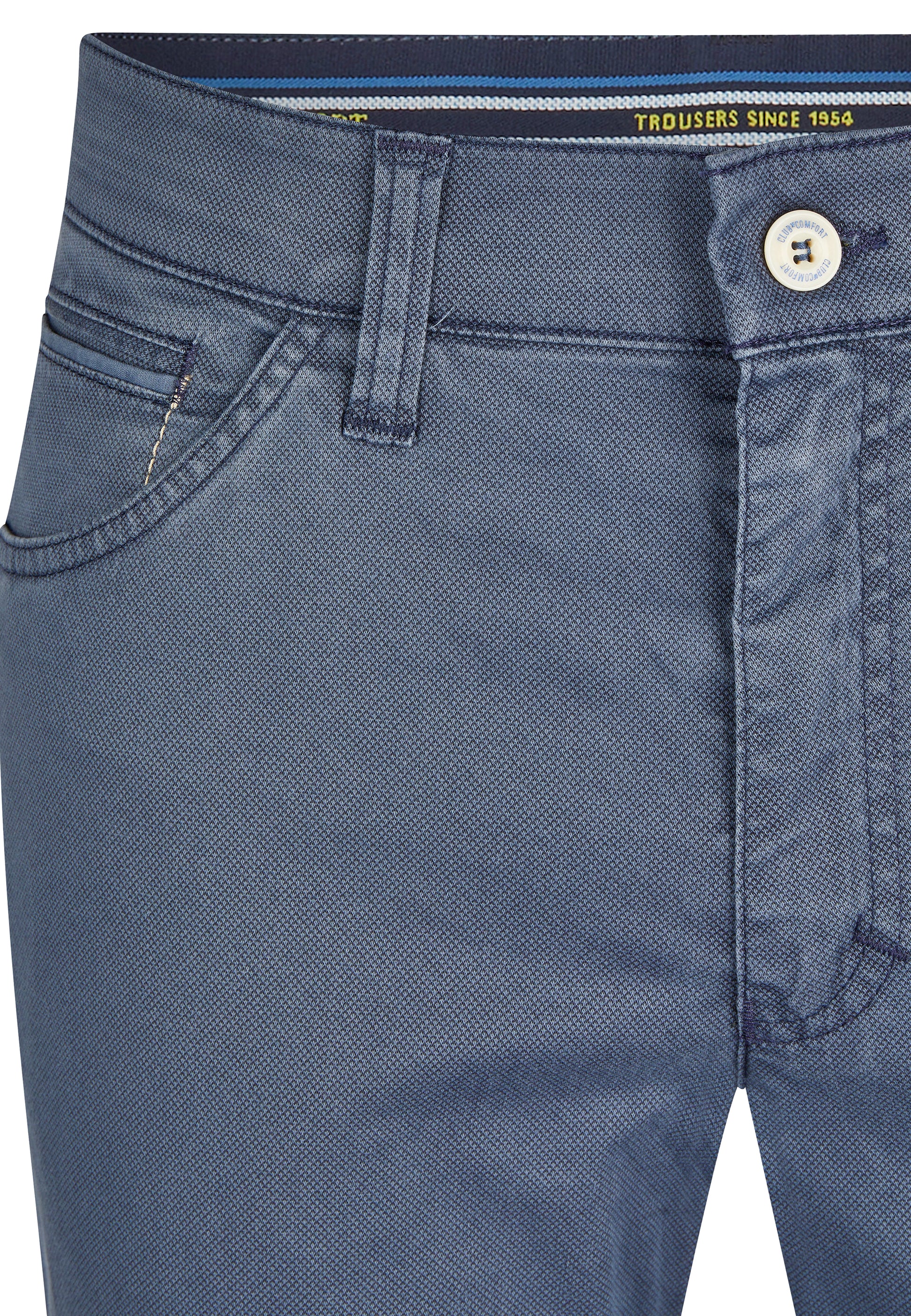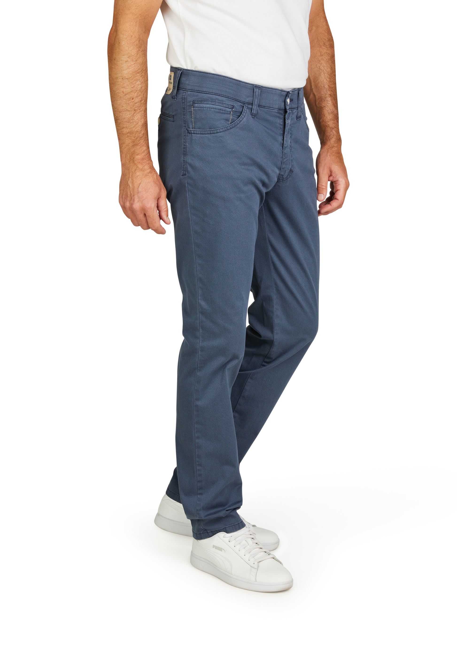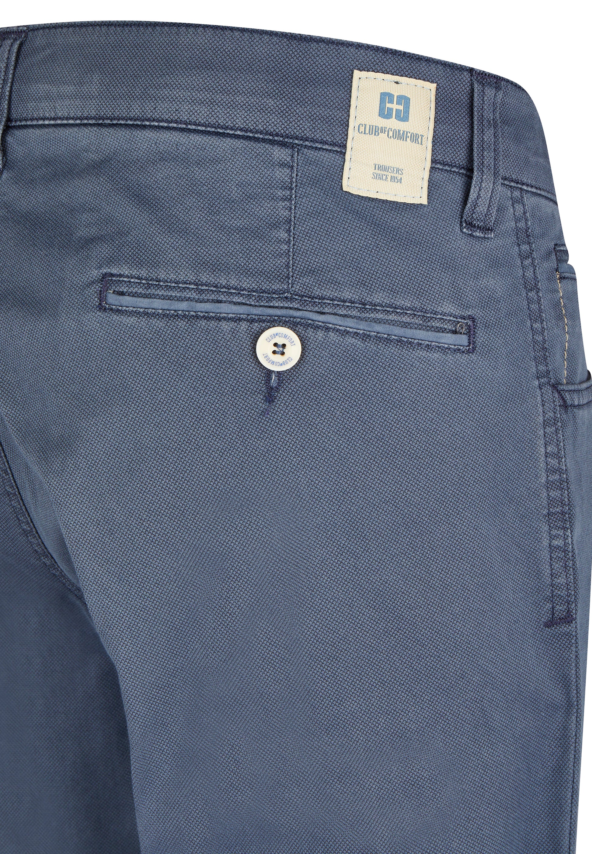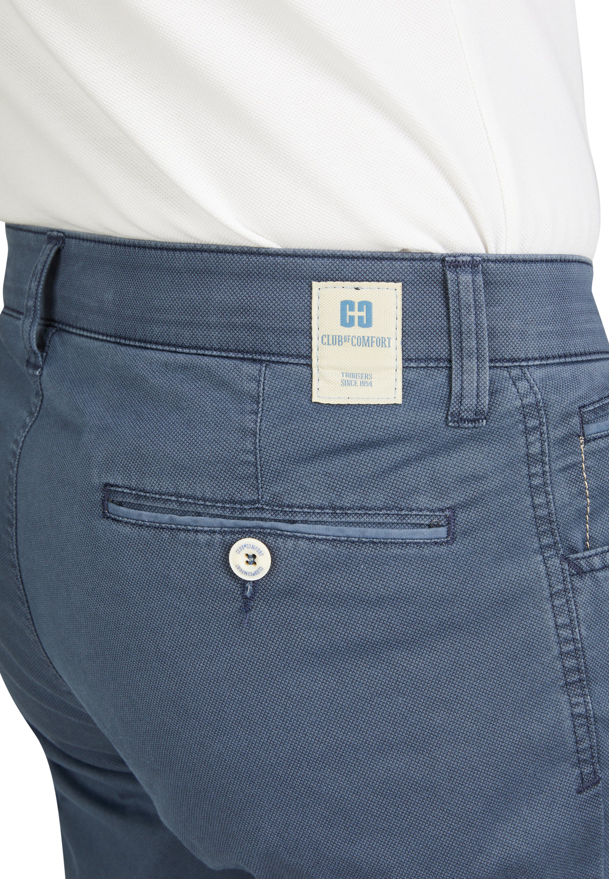 Bequeme Swing-Pocket mit elastischem Comfortbund und Hemdstopper. Die doppelt paspelierte Münztasche bringt einen Hauch Sportivität in den Look. Gefertigt aus einem leichten Baumwoll-High Stretch mit Mikro-Print. Der auffällige Druck bringt Dynamik in den Look. Gewicht: 270 g/lfm Das Modell verfügt über eine normale Leibhöhe und ein schlankes Bein bei schmaler Fußweite.