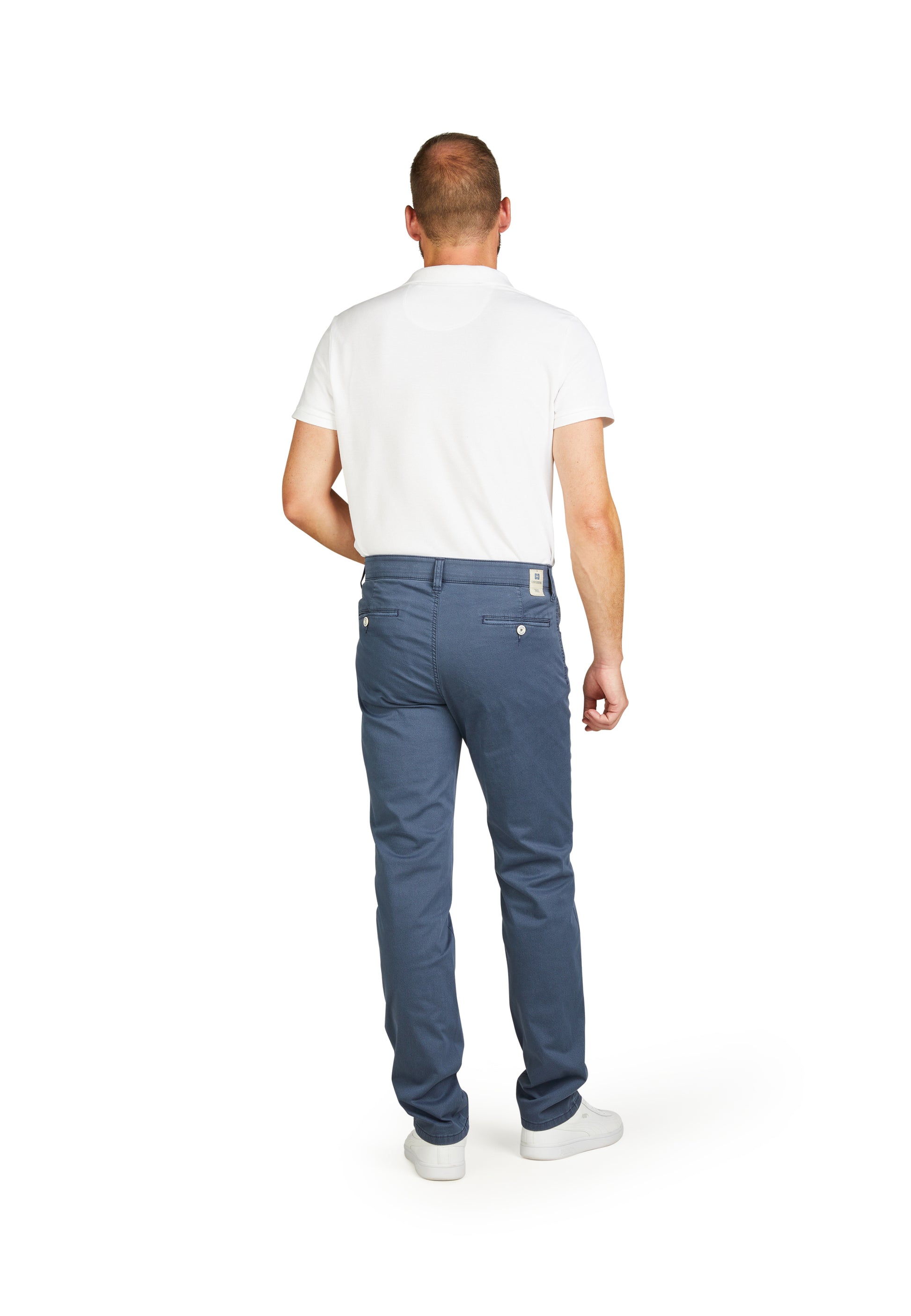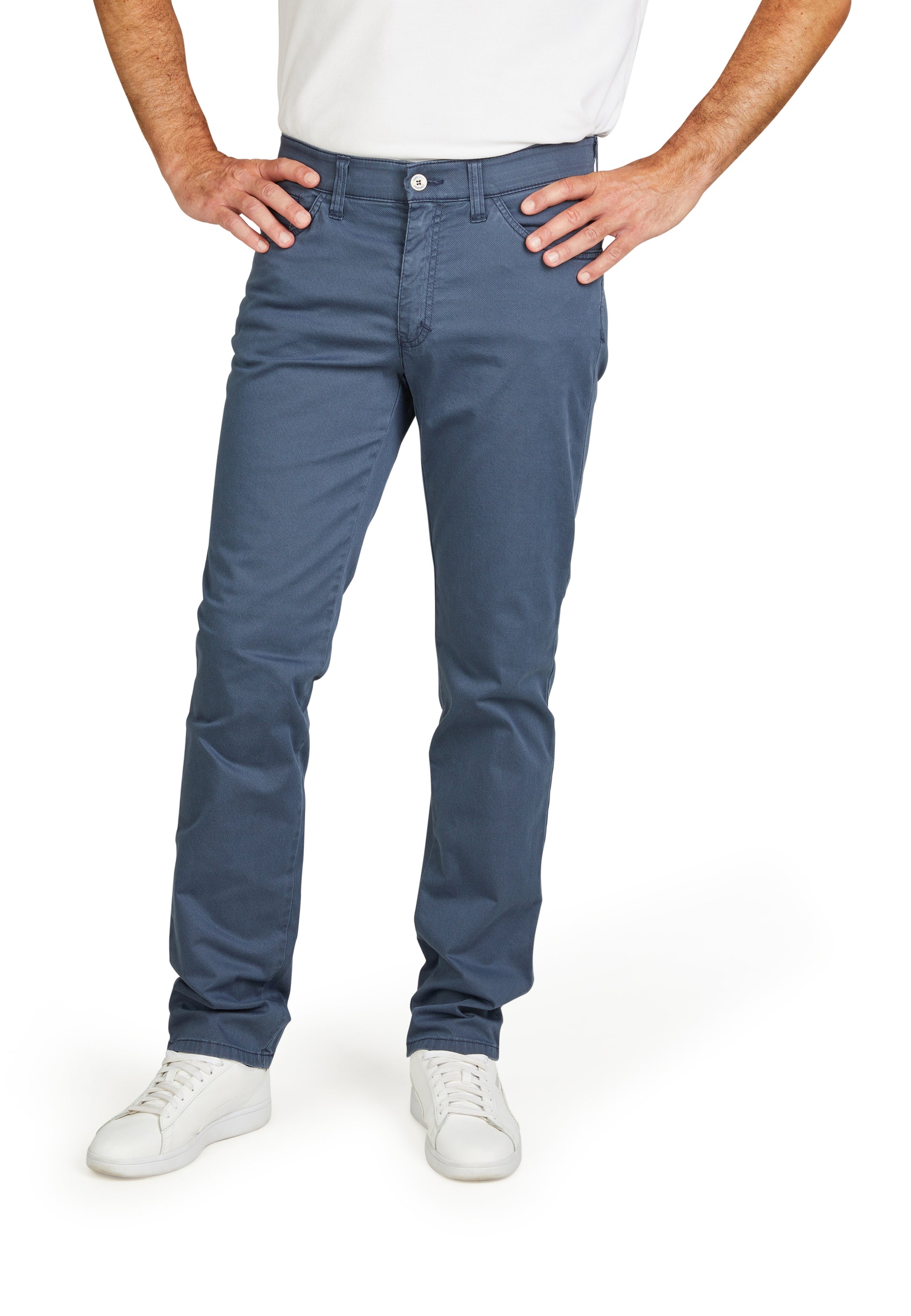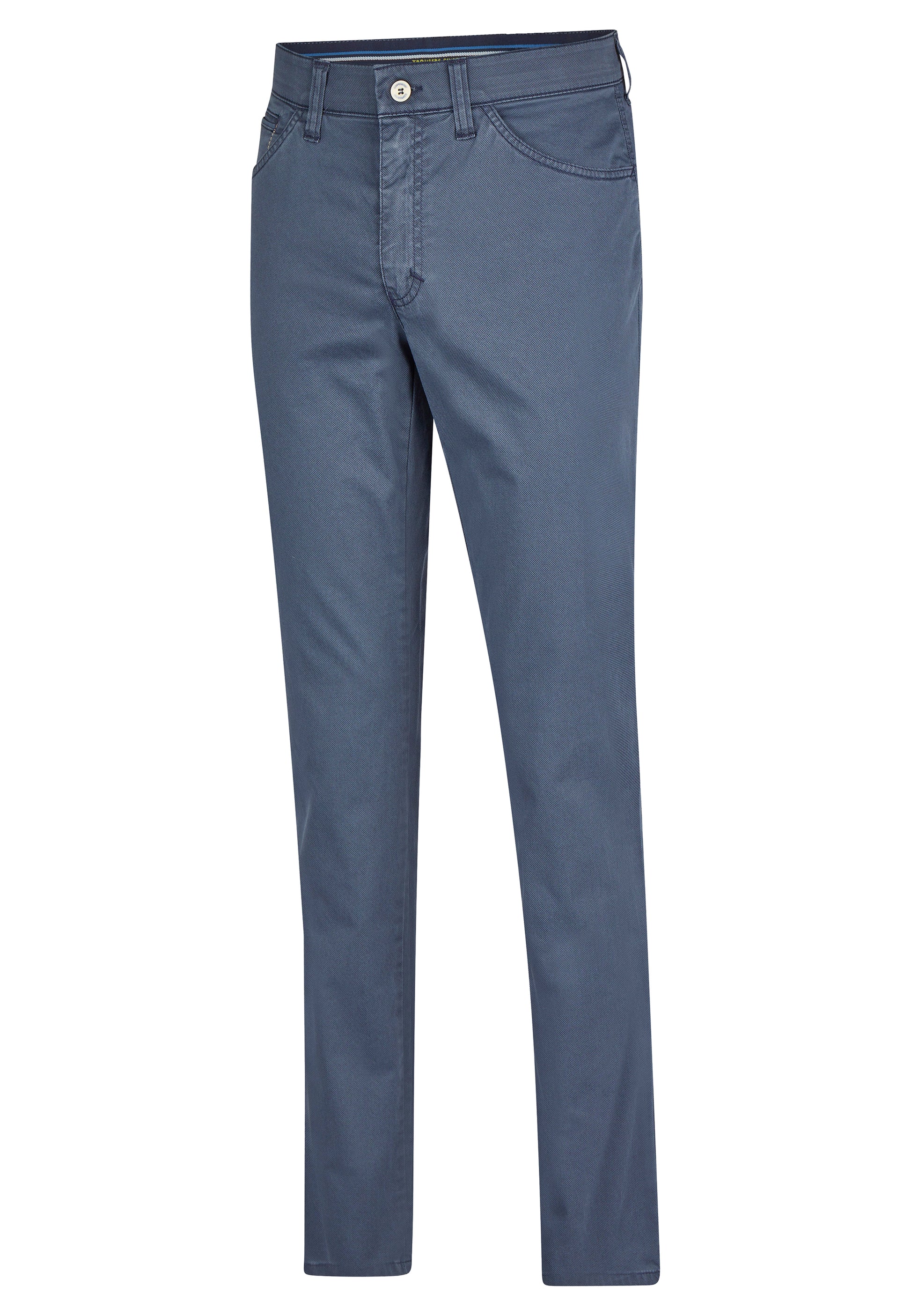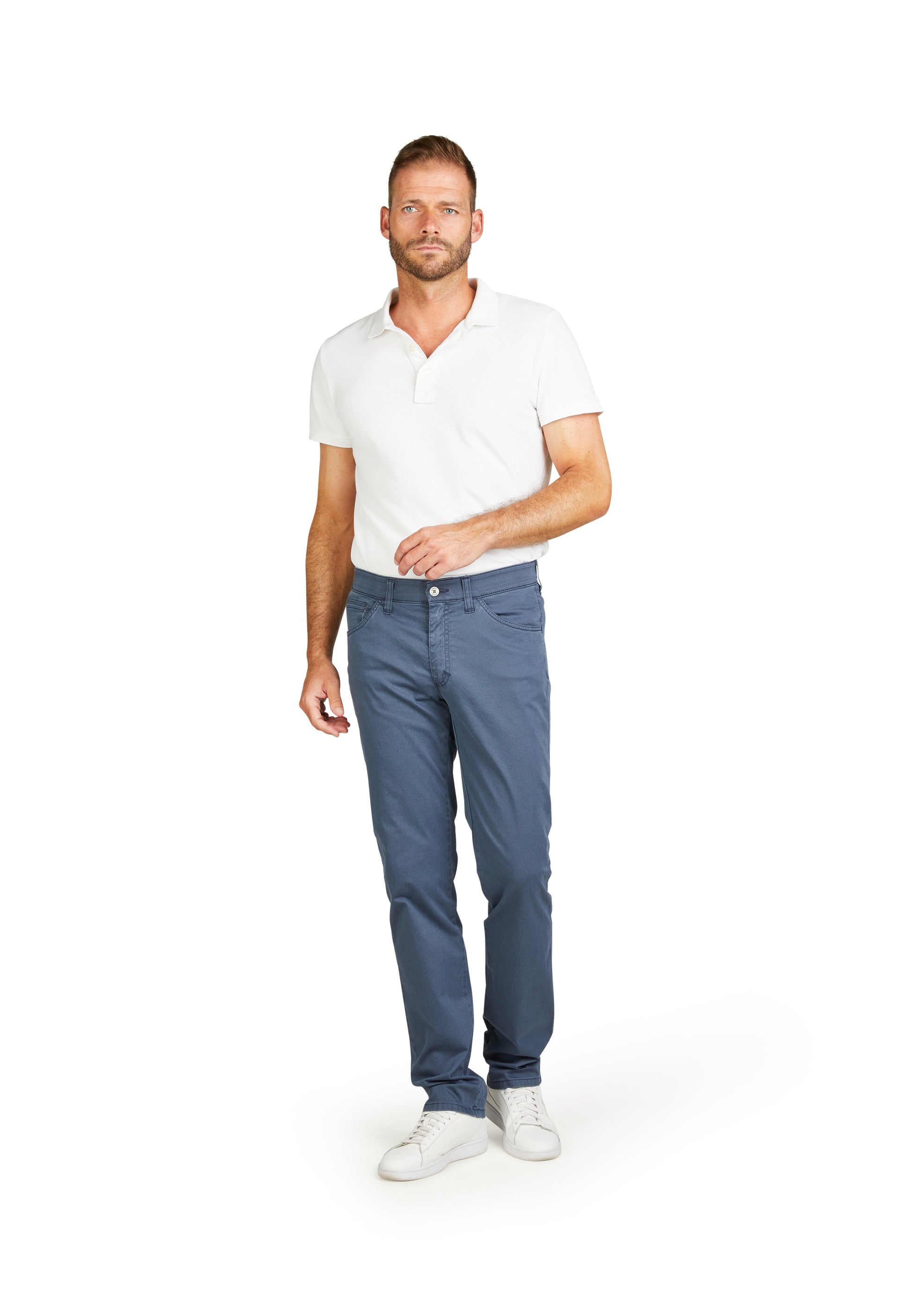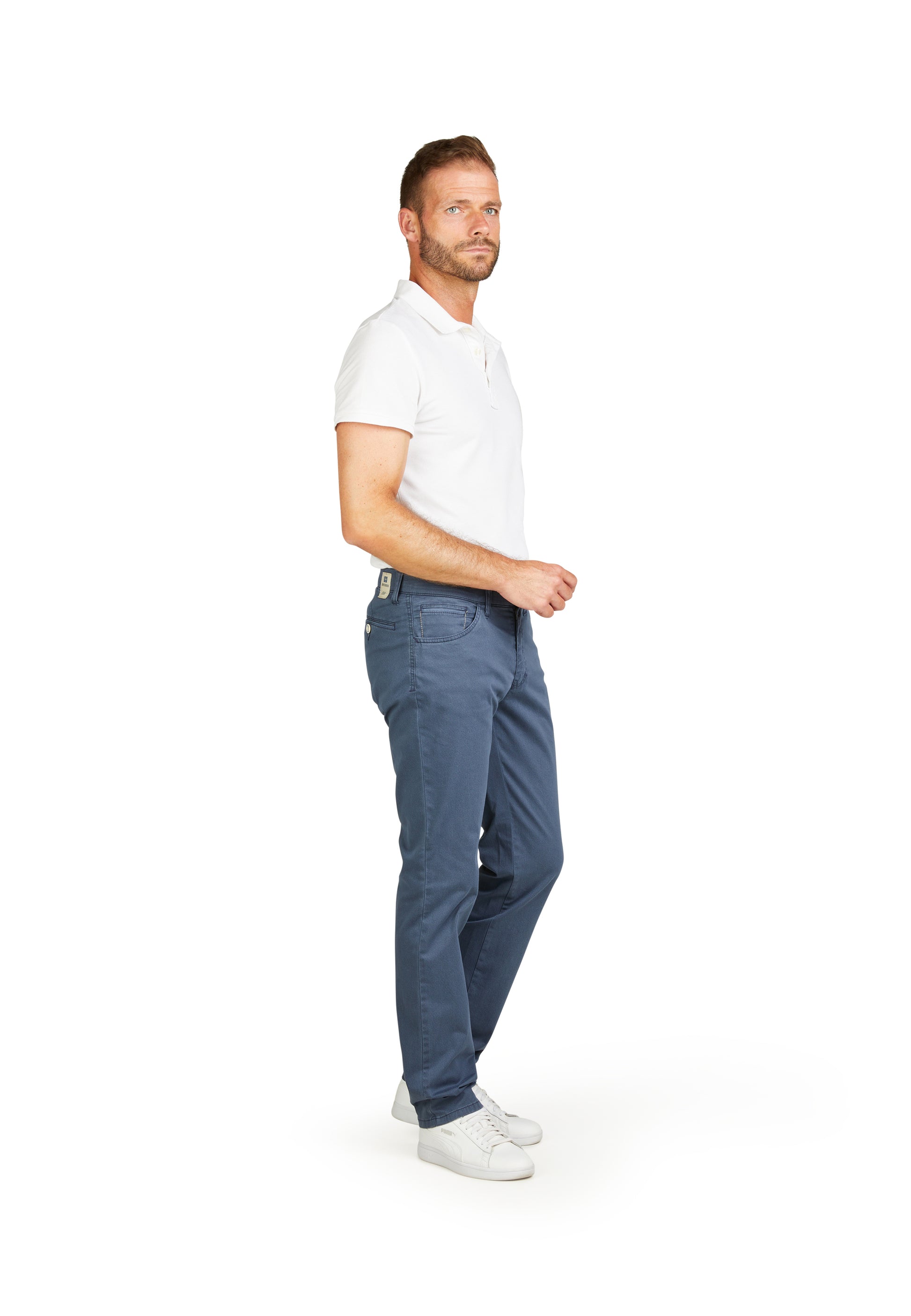 Bequeme Swing-Pocket mit elastischem Comfortbund und Hemdstopper. Die doppelt paspelierte Münztasche bringt einen Hauch Sportivität in den Look. Gefertigt aus einem leichten Baumwoll-High Stretch mit Mikro-Print. Der auffällige Druck bringt Dynamik in den Look. Gewicht: 270 g/lfm Das Modell verfügt über eine normale Leibhöhe und ein schlankes Bein bei schmaler Fußweite.