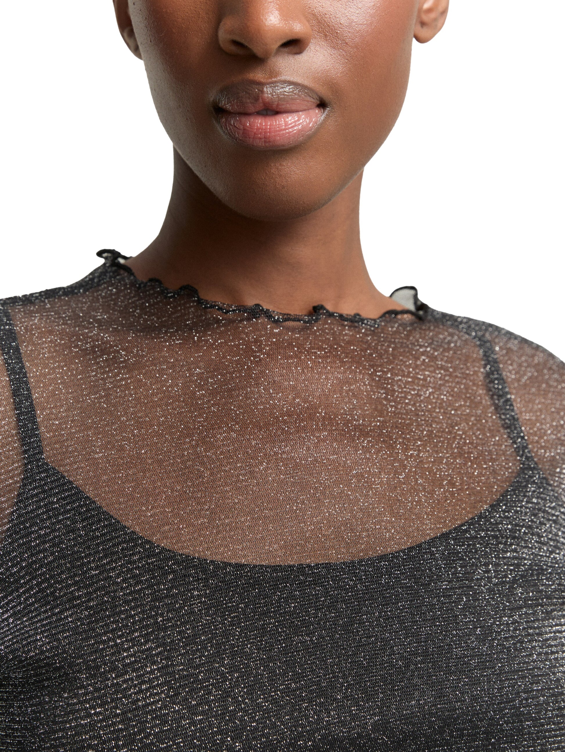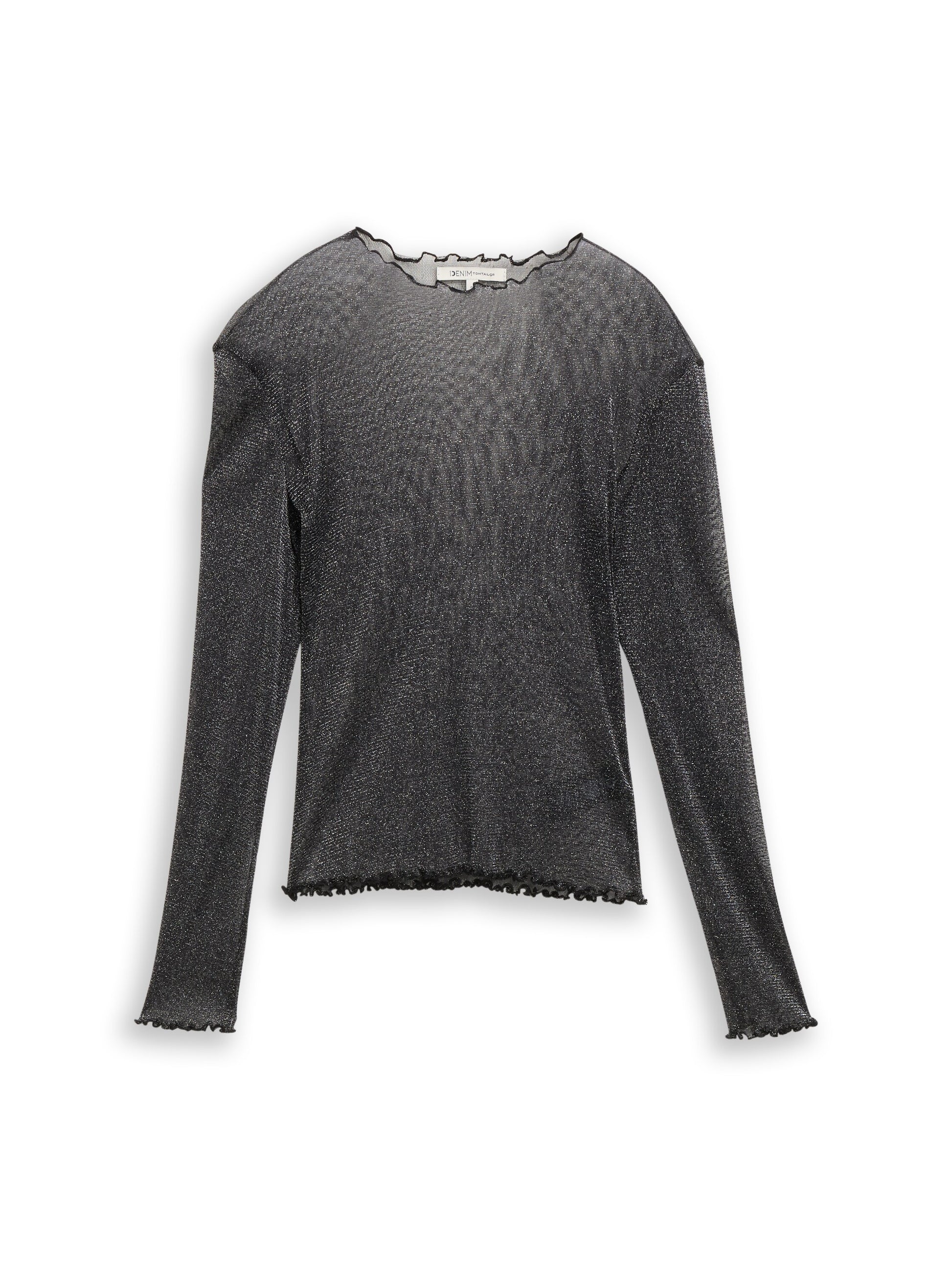 Slim Fit Longsleeve mit gewellten Saumkanten. Aus einem transparenten Mesh-Stoff mit Glitzer-Effekt.