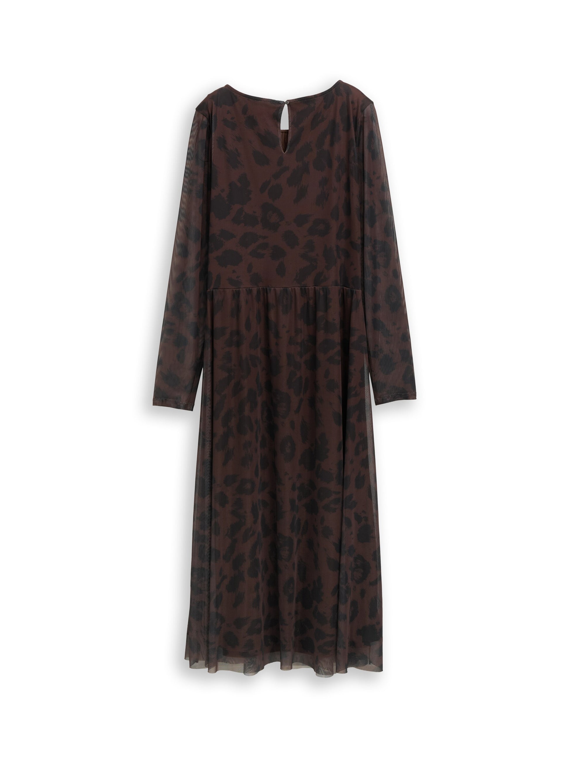 Gemustertes Midi-Kleid aus einem fließenden, knitterarmen Mesh-Stoff mit semi-transparenten Ärmeln. Mit kleinen Raffungen an der Taille und Knopfverschluss auf der Rückseite.