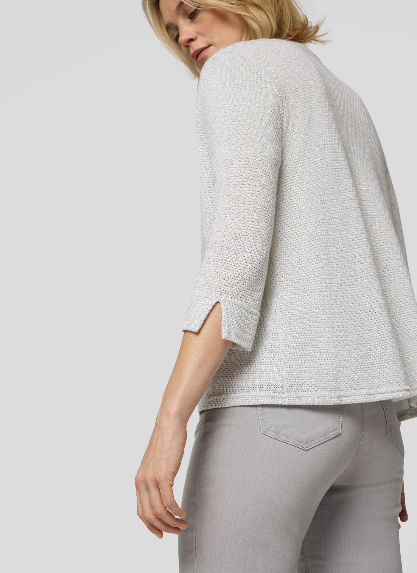 Dieser Cardigan überzeugt durch seine besondere Materialkomposition aus 87 % Viskose und 13 % Maguey. Die Viskose sorgt für ein angenehm weiches, fließendes Tragegefühl, während die Maguey-Faser dem Strick eine natürliche Struktur und dezente Standfestigkeit verleiht. Die offene Form ohne Verschluss, die 3/4-Ärmel mit kleinem Schlitz sowie die feine Strickoptik machen ihn zum vielseitigen Begleiter für leichte Layering-Looks. Luftige, strukturierte Qualität. Offene, verschlusslose Form. 3/4-Arm mit Schlitz. Angenehm weich im Griff.