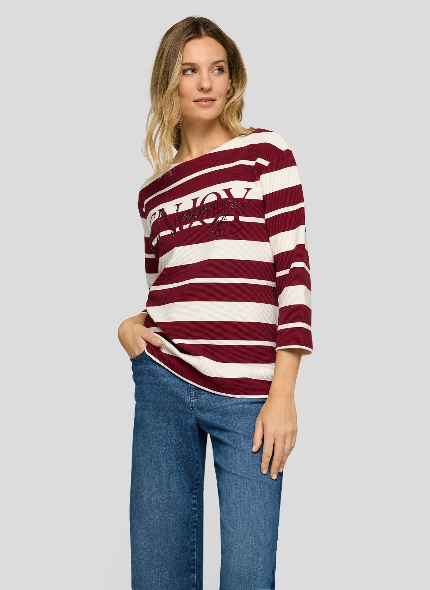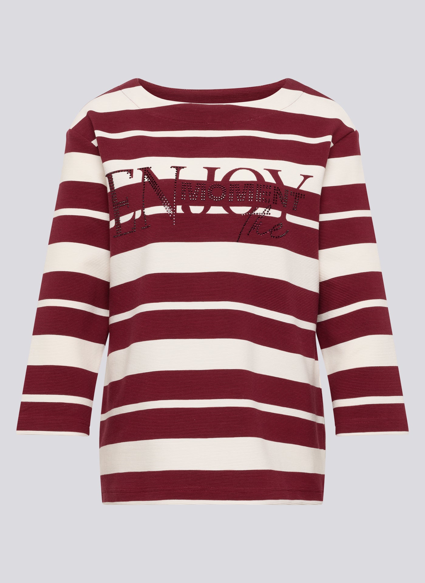 Dieses Ringelshirt mit 3/4-Arm kombiniert klassische Streifen mit einem modernen Schriftzugprint, der durch funkelnde Strasssteine veredelt wird. Die strukturierte Oberfläche sorgt für eine besondere Haptik, während der elastische Materialmix hohen Tragekomfort garantiert. Ein stilvoller Hingucker für gepflegte Casual-Looks. Strukturierte Jerseyware. Glitzernde Strasssteine vorn. Dekorativer Frontprint. 3/4-Ärmel mit bequemem Sitz. Klassischer Rundhalsausschnitt.