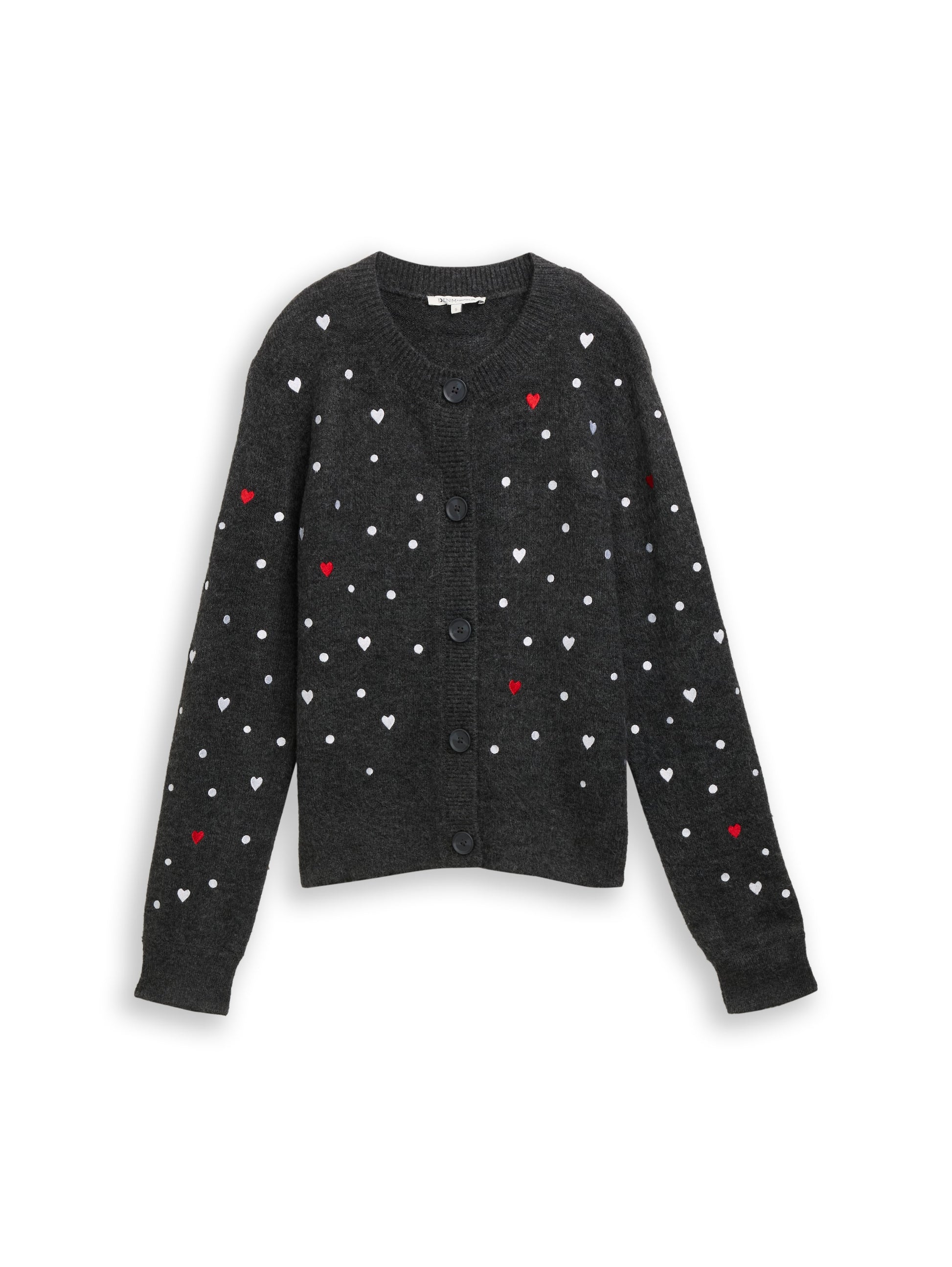 Weiche Strickjacke mit Herz- und Punkt-Stickereien auf der Vorderseite und an den Ärmeln