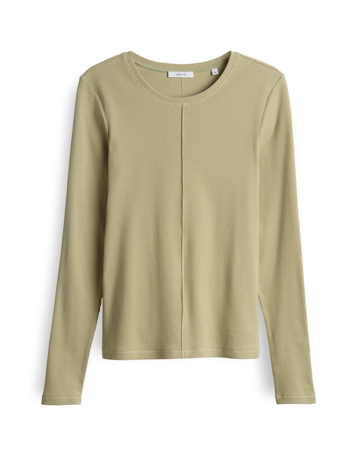 schmale Passform, gerader Schnitt, normale Länge, Langarm, Rundhalsausschnitt, Rückenlänge ca. 58 cm bei Größe 36, Model Größe 178 cm – trägt Größe 36, Jersey, feine Rippstruktur, weicher Griff, elastischer Stoff, schmaler Bund, Längsnaht vorne und hinten