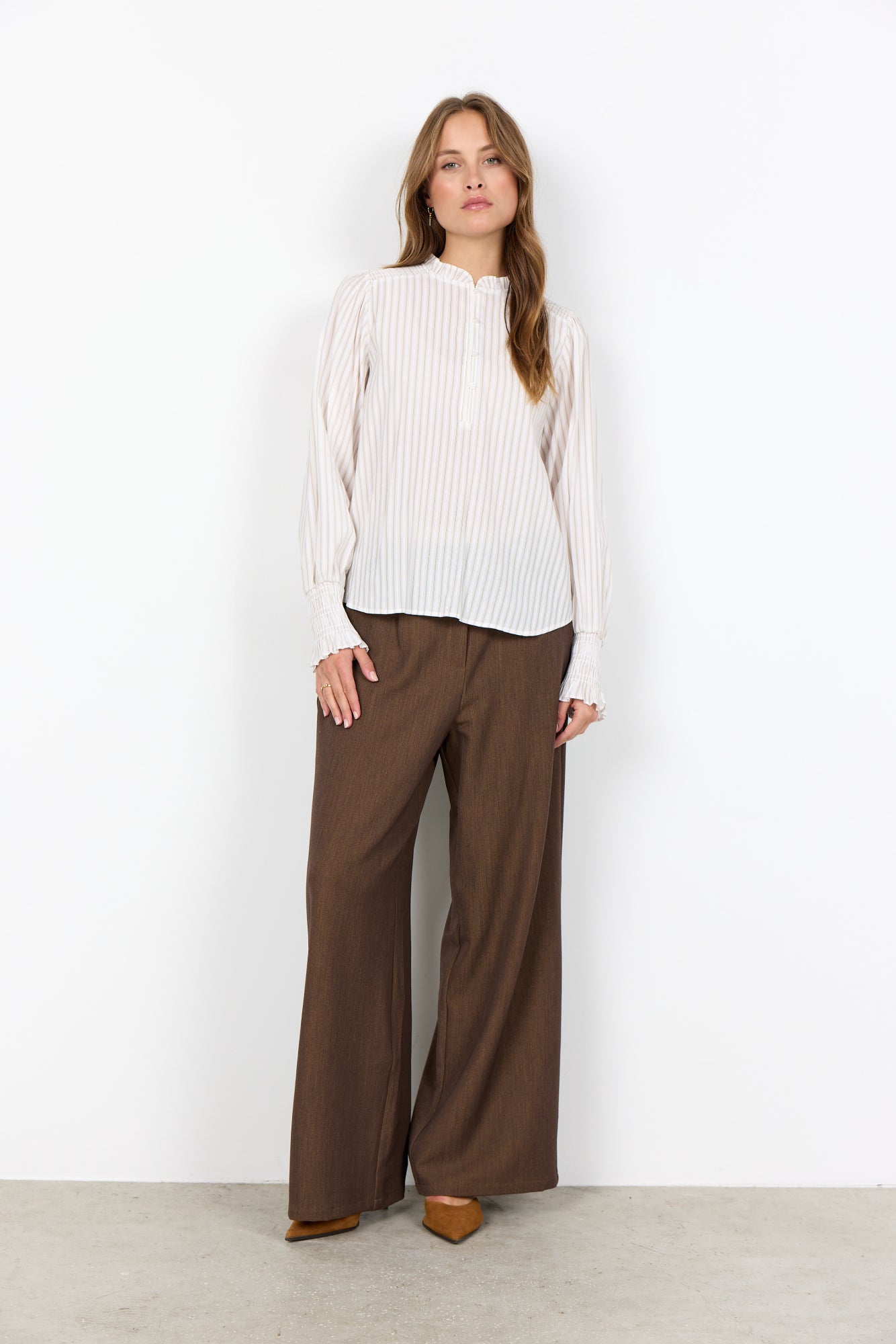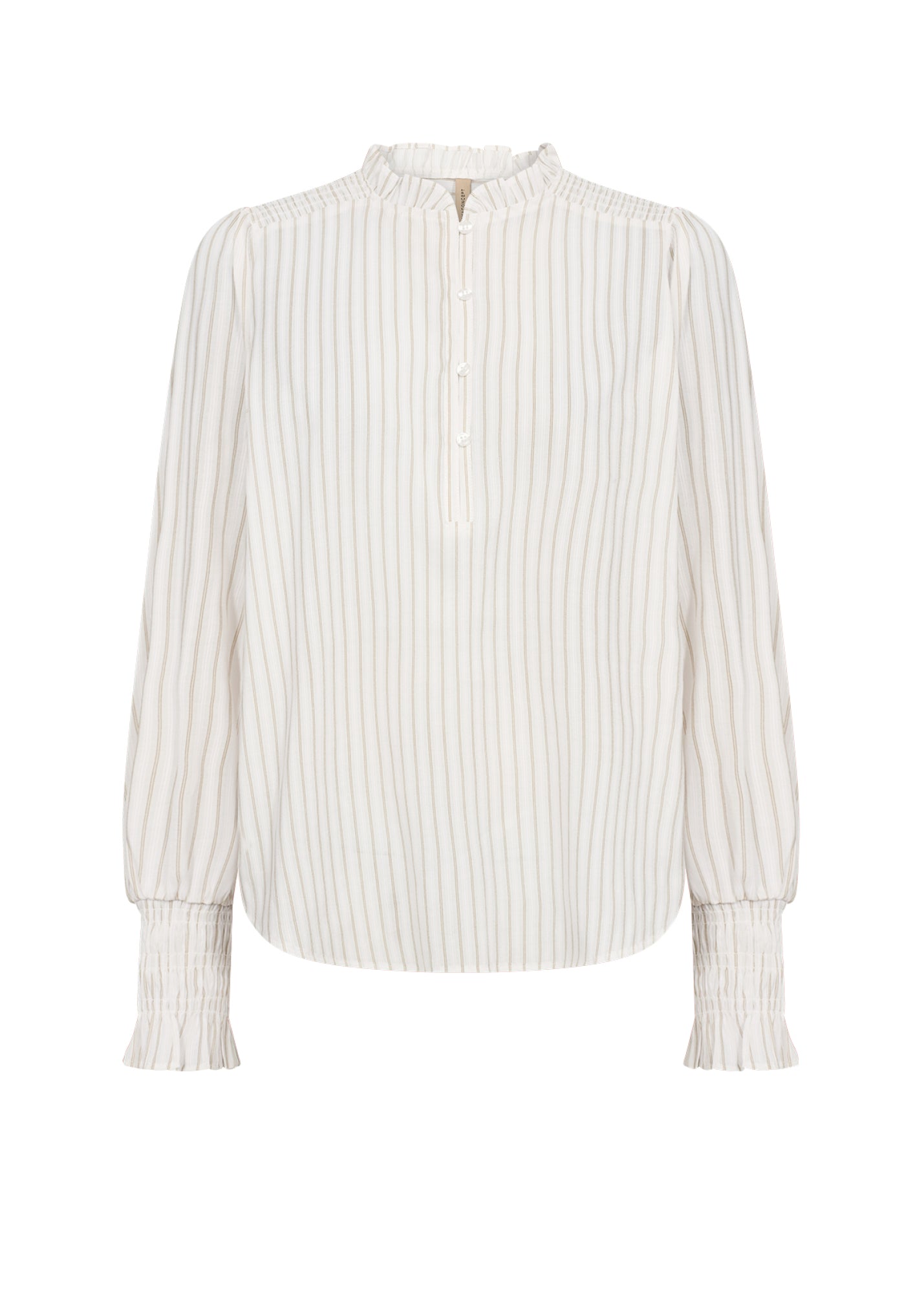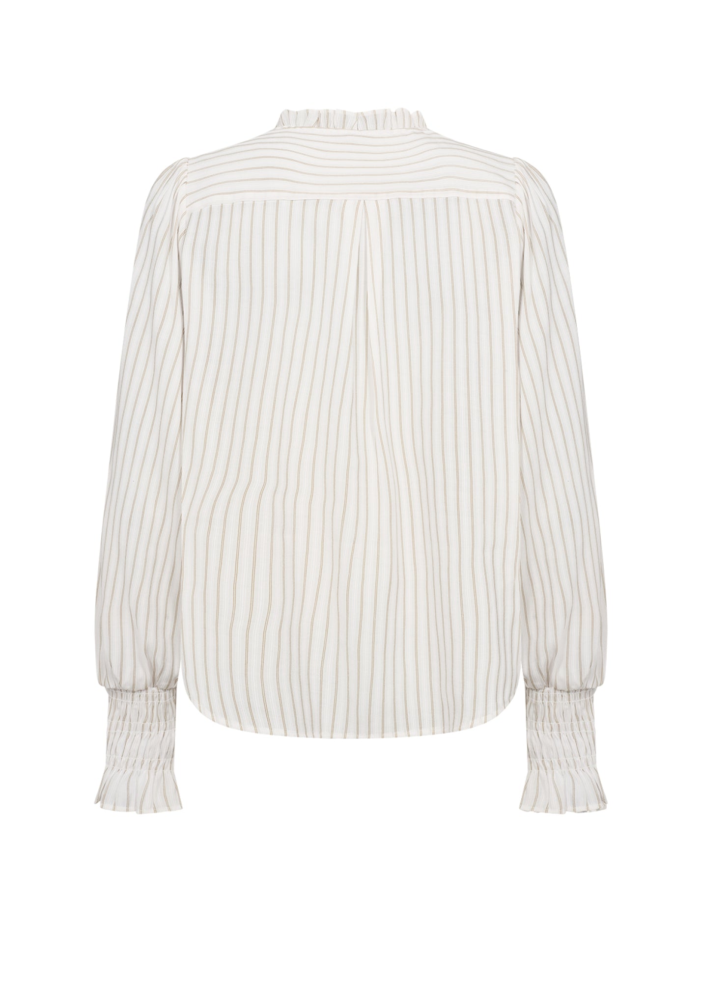 Die SC-ARIANNE 1 Bluse ist aus 80% LENZING™ ECOVERO™ Viskose und 20% Polyester gefertigt. Sie hat einen zarten Rüschenkragen, einen Knopfverschluss, lange Ärmel mit gesmokten Manschetten und eine dezent gestreifte Textur. Kombiniere es mit maßgeschneiderten Hosen für einen eleganten Look oder mit Jeans für einen lässigen Stil.