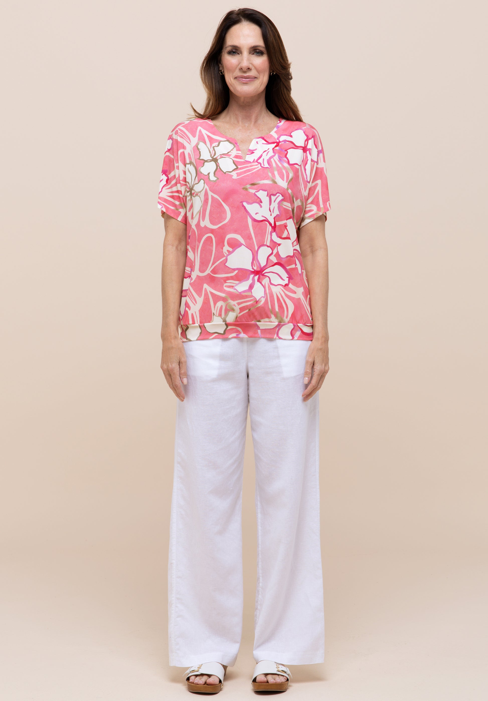 Unser sommerliches Print-Shirt Sia überzeugt mit einem attraktiven Allover-Dessin und vielseitigen Styling-Möglichkeiten. Die lockere Passform mit breitem Saumbündchen und pflegeleichtem Materialmix sorgt für angenehmen Tragekomfort. Ein Rundhalsausschnitt mit V-Cut-Out und der kurze, überschnittene Arm verleihen dem Look eine lässige Note. Sia, ein unkompliziertes Lieblingsstück für warme Tage!