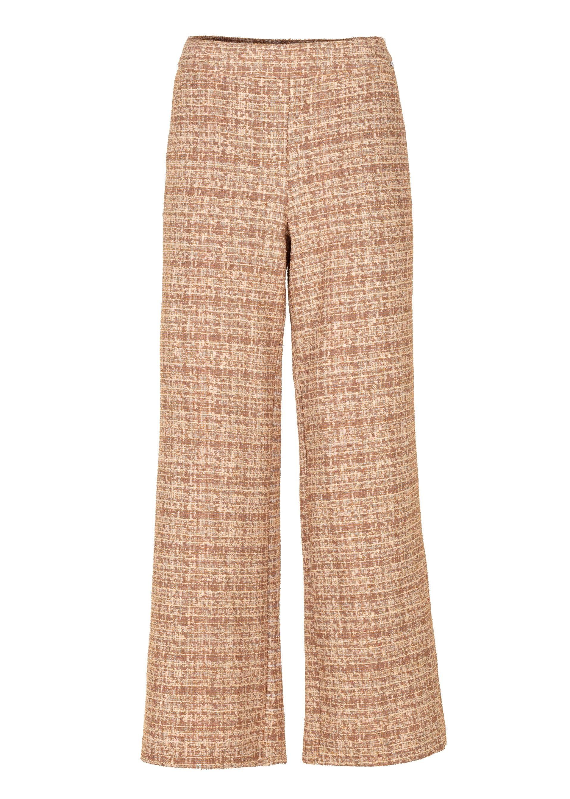 This stylish pair of trousers blends comfort with elegance, thanks to the soft bouclé jersey in a multicolored melange. The flared legs create a flattering silhouette, while the elastic waistband adds extra wearing comfort. The playful textured effect of the bouclé fabric gives the trousers a unique and refined appearance. Perfect for both a relaxed day and a polished look.