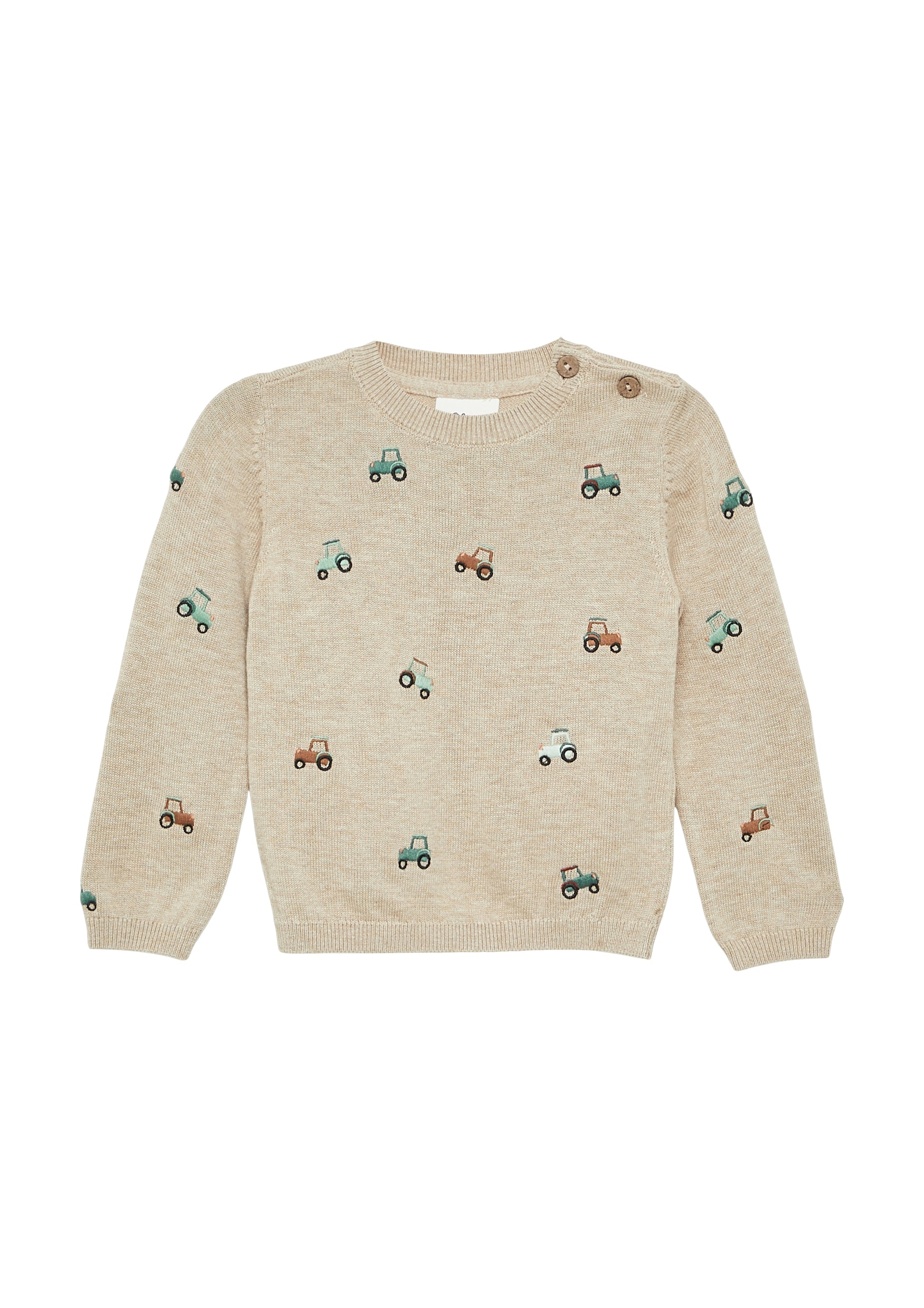 Gemütlicher Feinstrickpullover mit niedlicher Traktor-Stickerei für deinen kleinen Entdecker. Der weiche Strickjersey hält warm und bietet Bewegungsfreiheit. Praktische seitliche Knöpfe erleichtern das An- und Ausziehen. Ein perfekter Begleiter für Ausflüge auf den Bauernhof oder Spielplatzabenteuer.