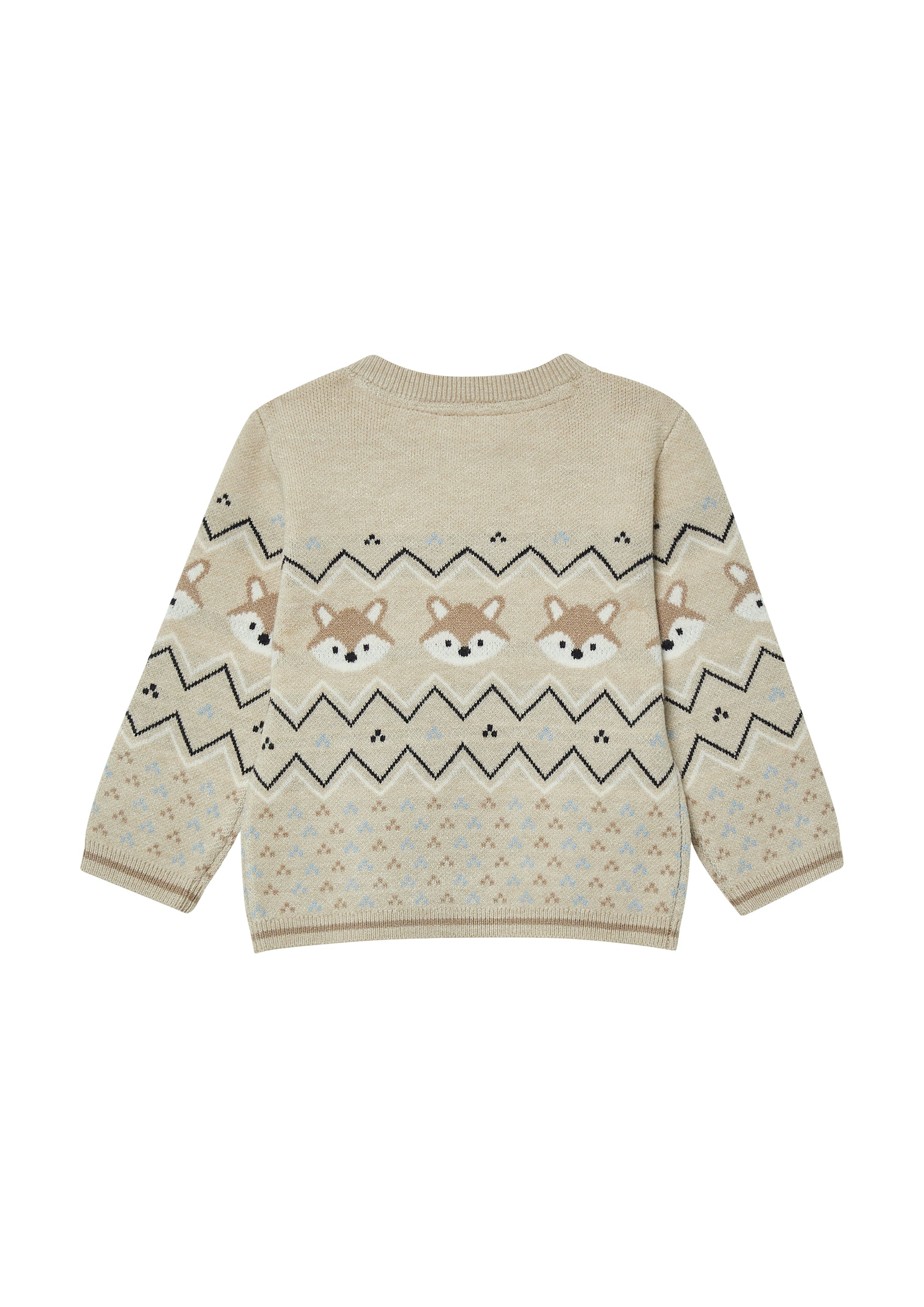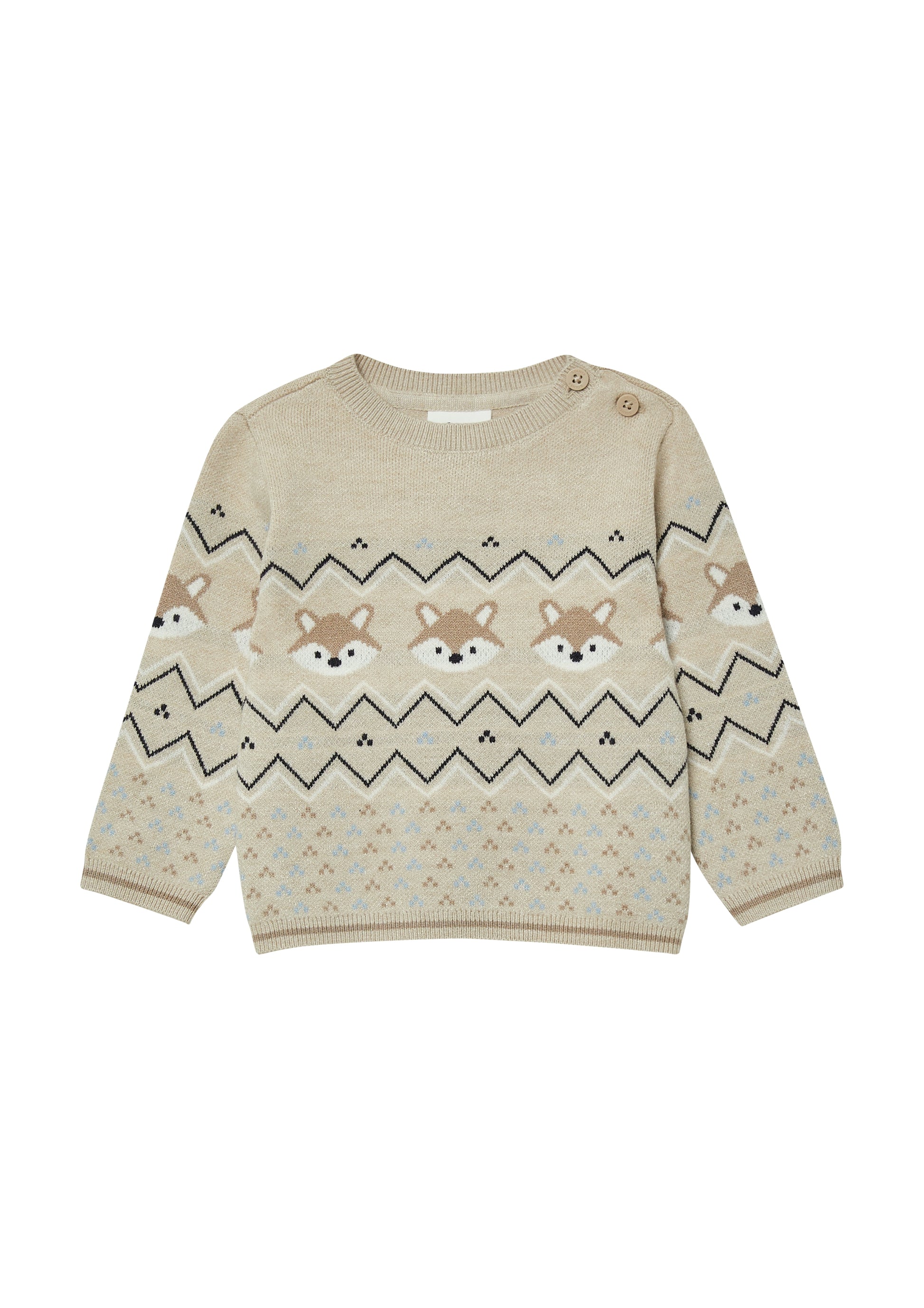 Gemütlicher Jacquard-Strickpullover mit fröhlichem Allover-Muster. Der weiche, elastische Stoff hält warm und bietet optimalen Tragekomfort. Mit praktischen seitlichen Knöpfen und Rippbündchen an Ärmeln sowie Saum. Ein vielseitiger Begleiter für kühle Tage.
