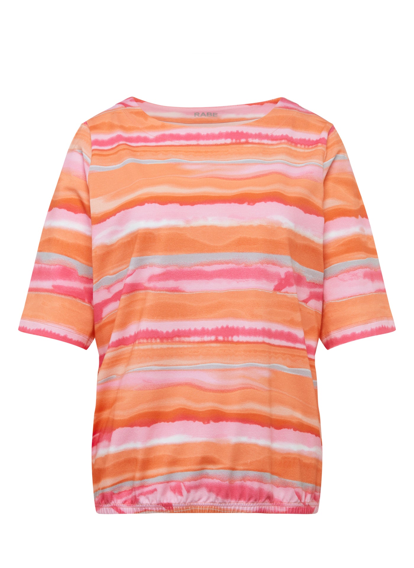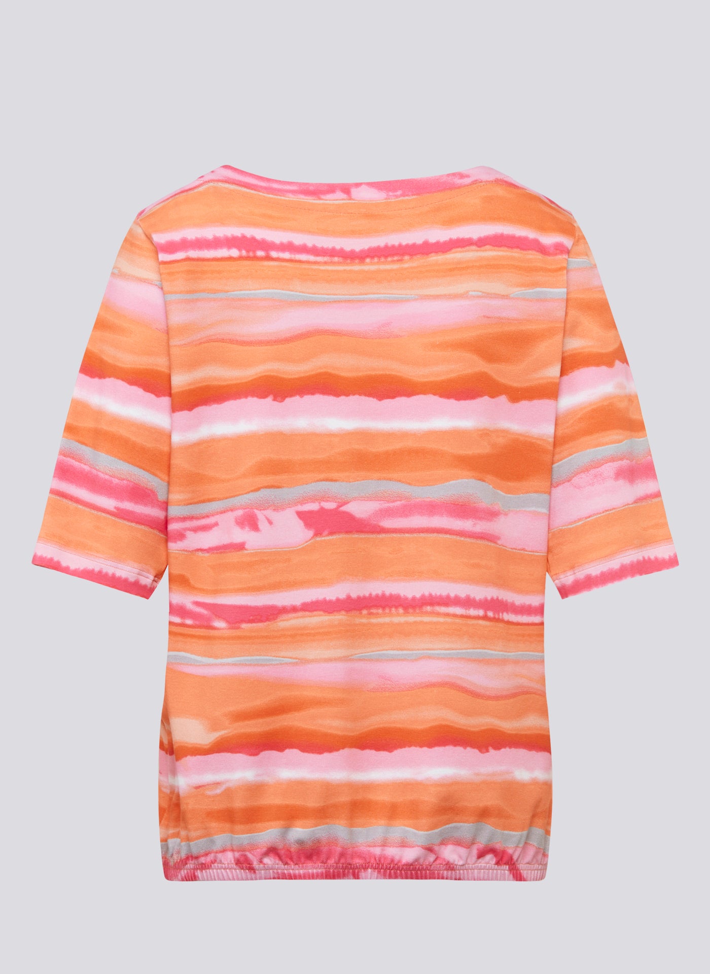 Die harmonische Kombination aus Pink-, Orange- und Koralltönen sorgt für einen fröhlichen, modernen Look. Dank des angenehmen Materials und der lockeren Passform ist es perfekt für warme Tage oder als Hingucker unter einer leichten Jacke. Strahlendes Aquarell-Streifenmuster _ Farbenfroher Hingucker für den Sommer. Rundhalsausschnitt _ Klassisch und bequem. Halbarm-Design _ Ideal für warme Temperaturen und vielseitig kombinierbar. Perfekt für Casual- oder Urlaubs-Looks _ Kombinierbar mit Jeans, Röcken oder Shorts.