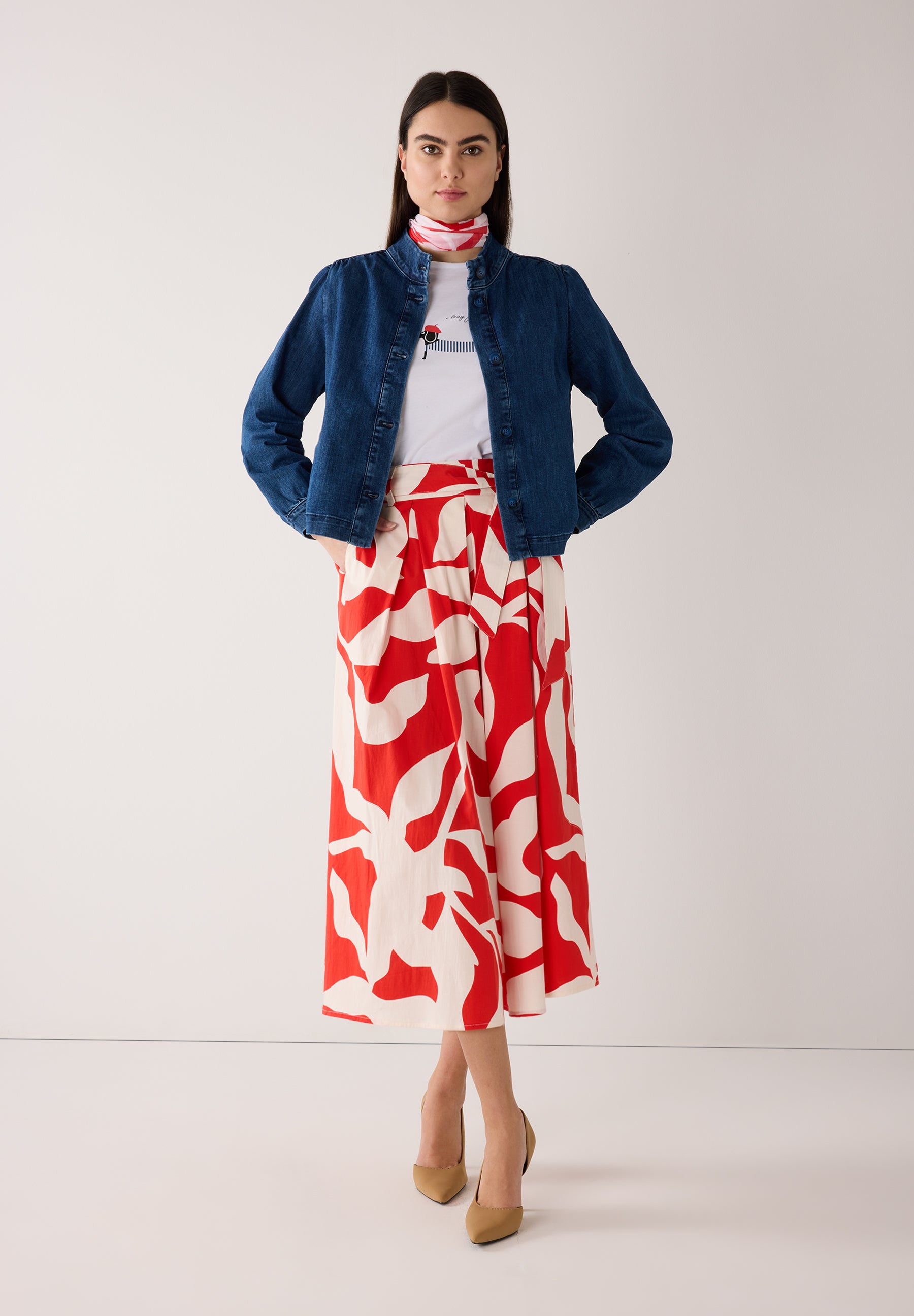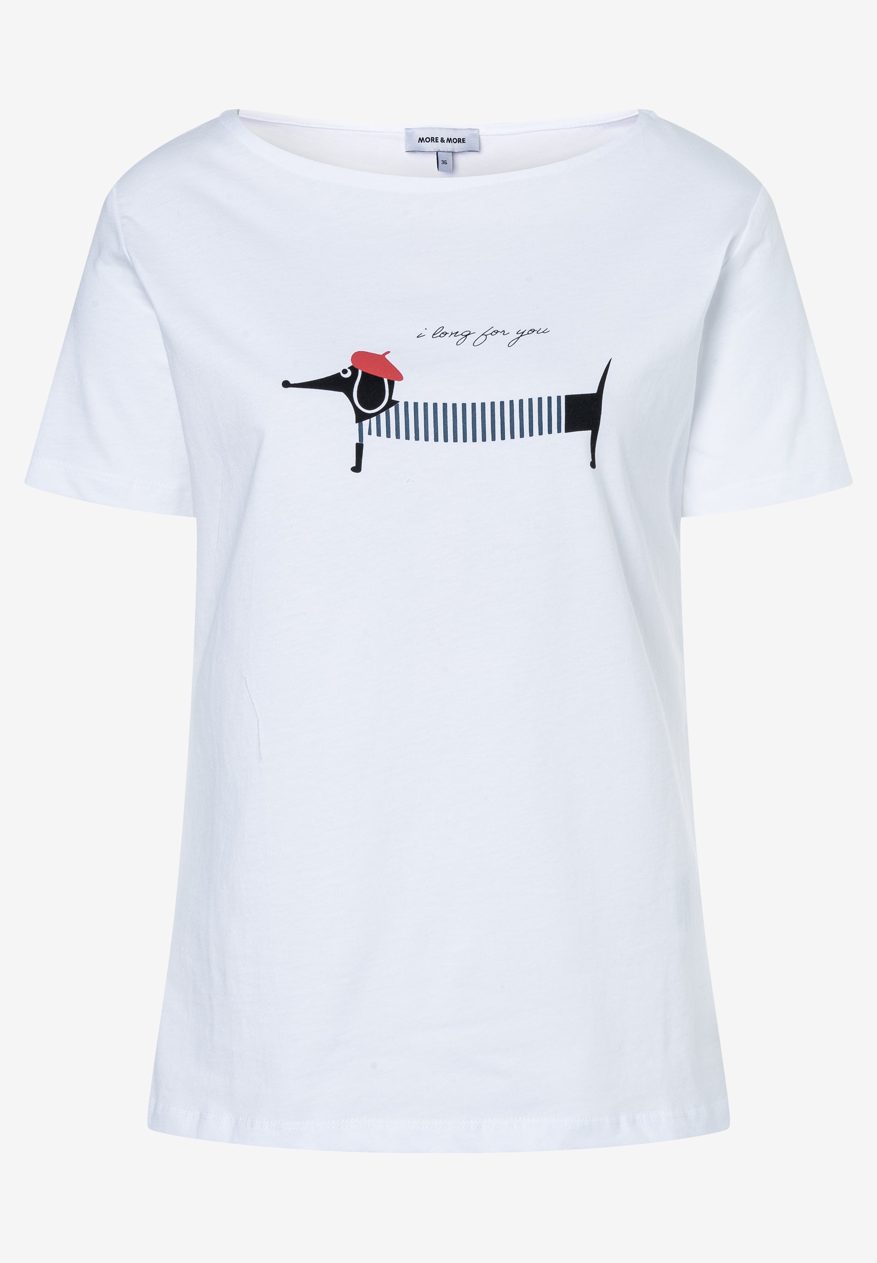 Das weiße Kurzarmshirt von MORE & MORE begeistert mit verspieltem Frontprint: ein stilisierter Dackel im Streifenlook mit roter Paillettenmütze sorgt für einen charmanten Hingucker und bringt eine Portion Humor in Ihre Garderobe. Aus angenehm softer Jerseyqualität gefertigt, ist das Shirt vielseitig kombinierbar und perfekt für schlichte Everyday-Looks mit einem Augenzwinkern.