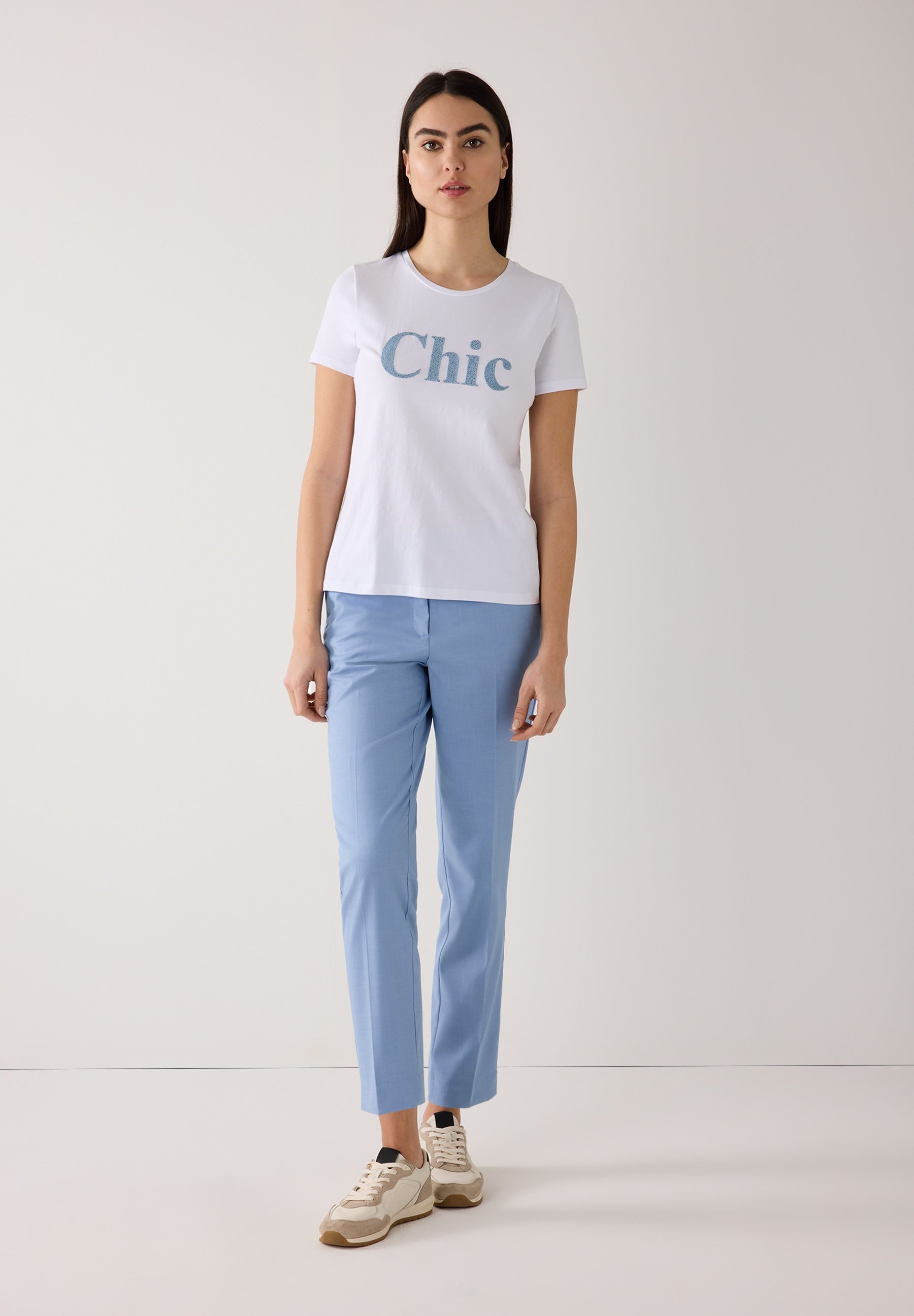 Das weiße Kurzarmshirt von MORE & MORE präsentiert sich mit markanter Perlenaufschrift auf der Front und sorgt für einen minimalistischen Statement-Look. Das zeitlose Design macht es zum vielseitigen Basic für stilvolle Casual-Outfits - perfekt kombinierbar zu Hose und Rock, oder auch zum klassischen Businessanzug.