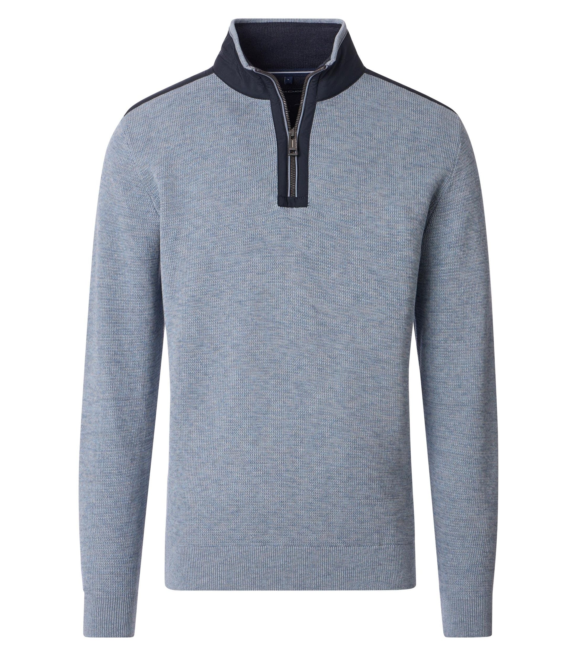 Dieser Strick-Troyer überzeugt mit zeitloser Eleganz und angenehmer Wärme. Die feine Strickstruktur sorgt für eine edle Optik, während der hohe Kragen mit Reißverschluss für einen modernen Touch sorgt. Ob über einem Hemd oder solo getragen – dieser Troyer ist ideal für stilbewusste Looks an kühleren Tagen.