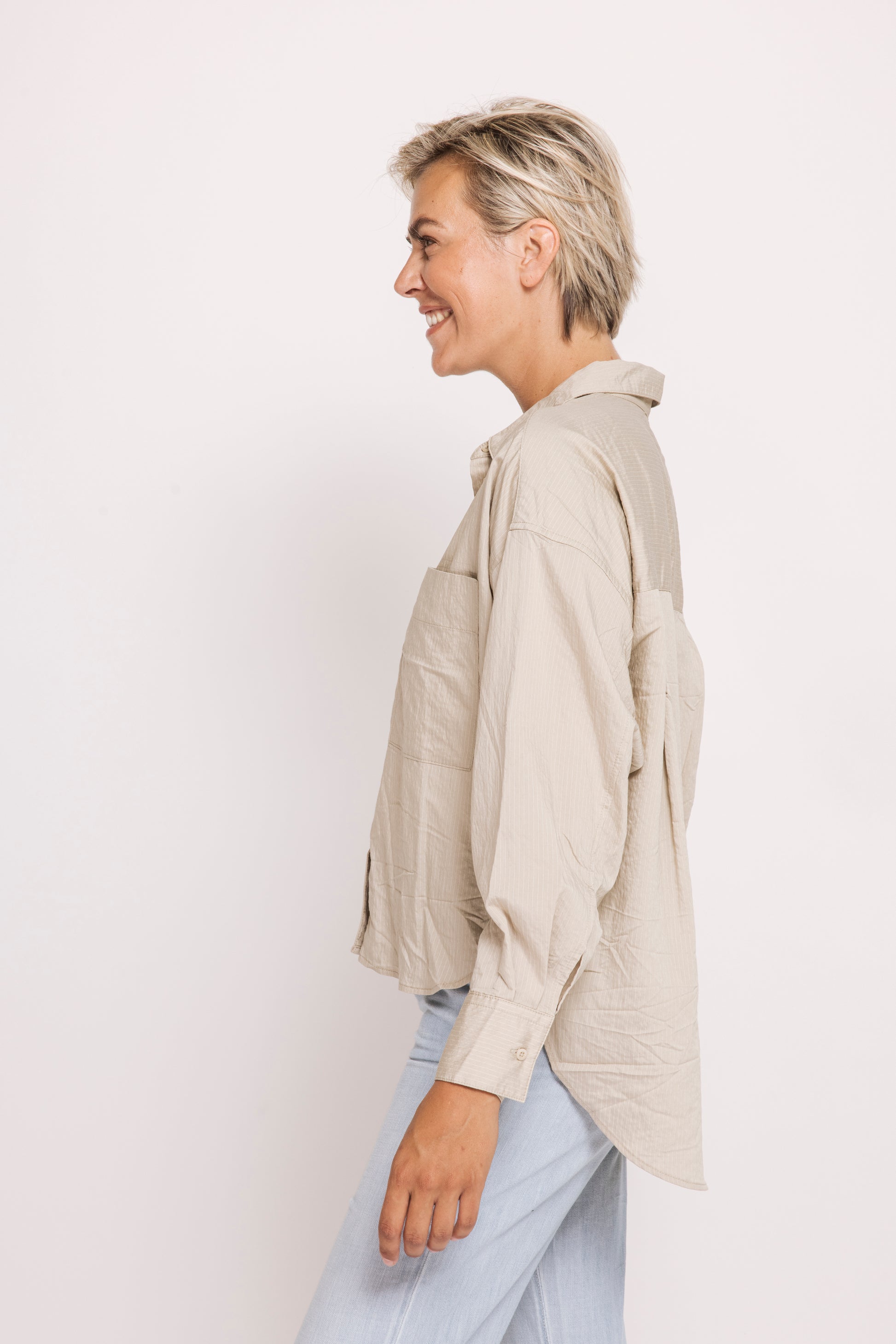- Überschnittene Schultern und gerundeter Saum